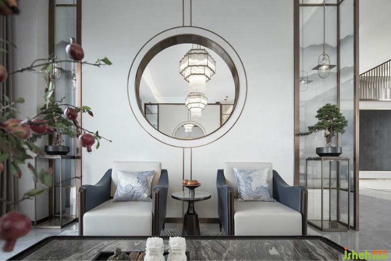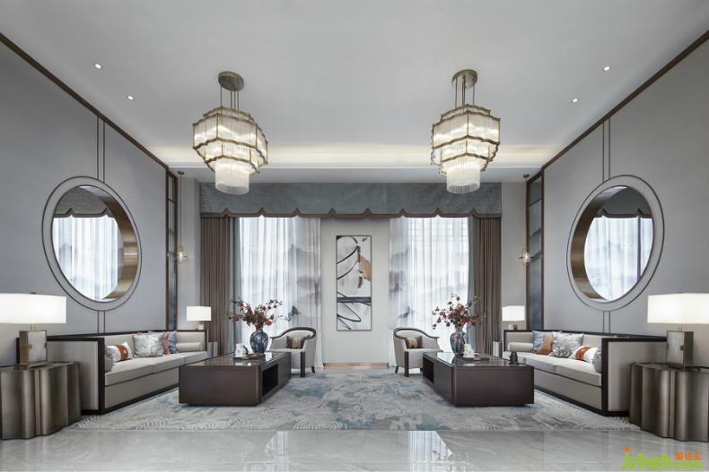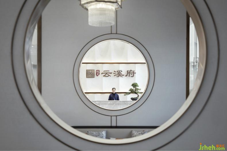 山水相逢,墨色入织,墙面上华丽用色的山水画,应和单椅上的水墨质感。双窗对应,大景开阔,一面以帘幕带出透光,室内设计师另一面以半隔断圆形窗让空间既开放又具有隐私性,虚实空间的婉转曲折,在藏露遮掩之间,让整个空间更具延伸与通透感。