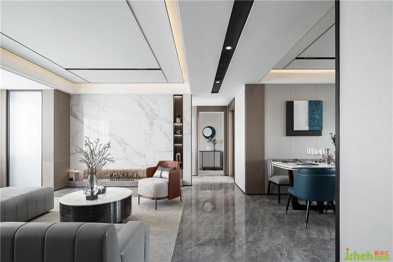 色彩总是引起审美愉悦中最为敏感的元素,蓝色和灰色的调和,使得雾霾蓝饱含内敛气质,设计师又将其融合在以灰色大理石为底的感光环境中,打破过于寂静的氛围,质感中带着丝丝神秘,提升着空间的轻奢感受。