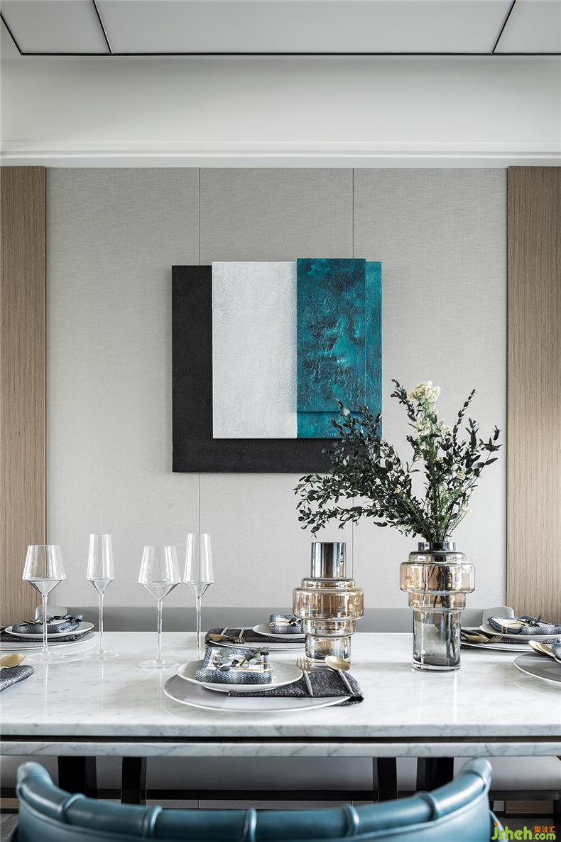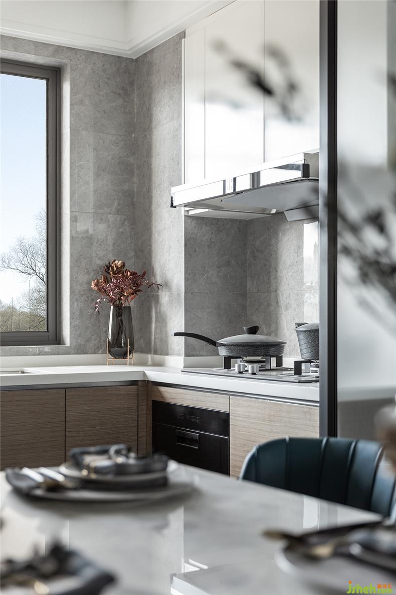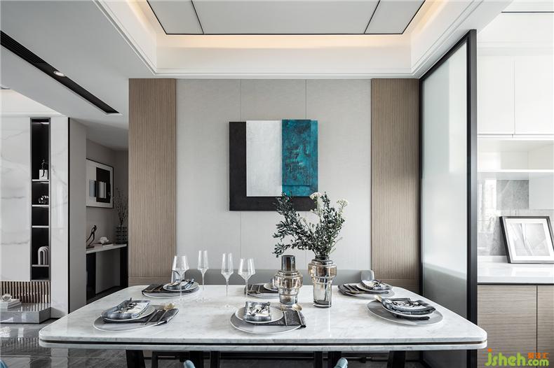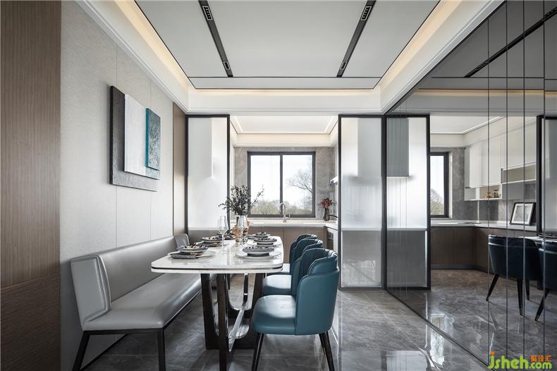 厨房与餐厅不设推门,解决了区域原本布局的狭窄弊端,同时利用镜面反射,样板房设计增强空间的开阔性,且一虚一实,再造呼应。
