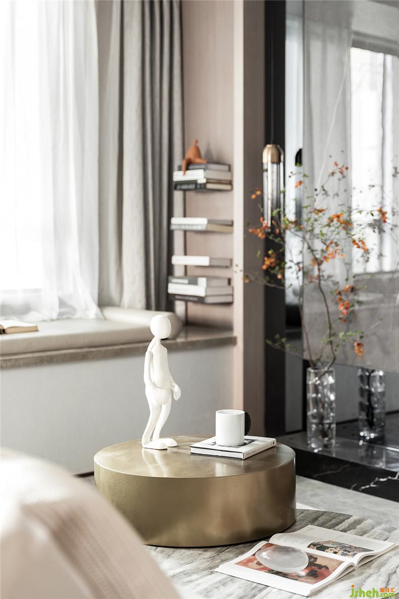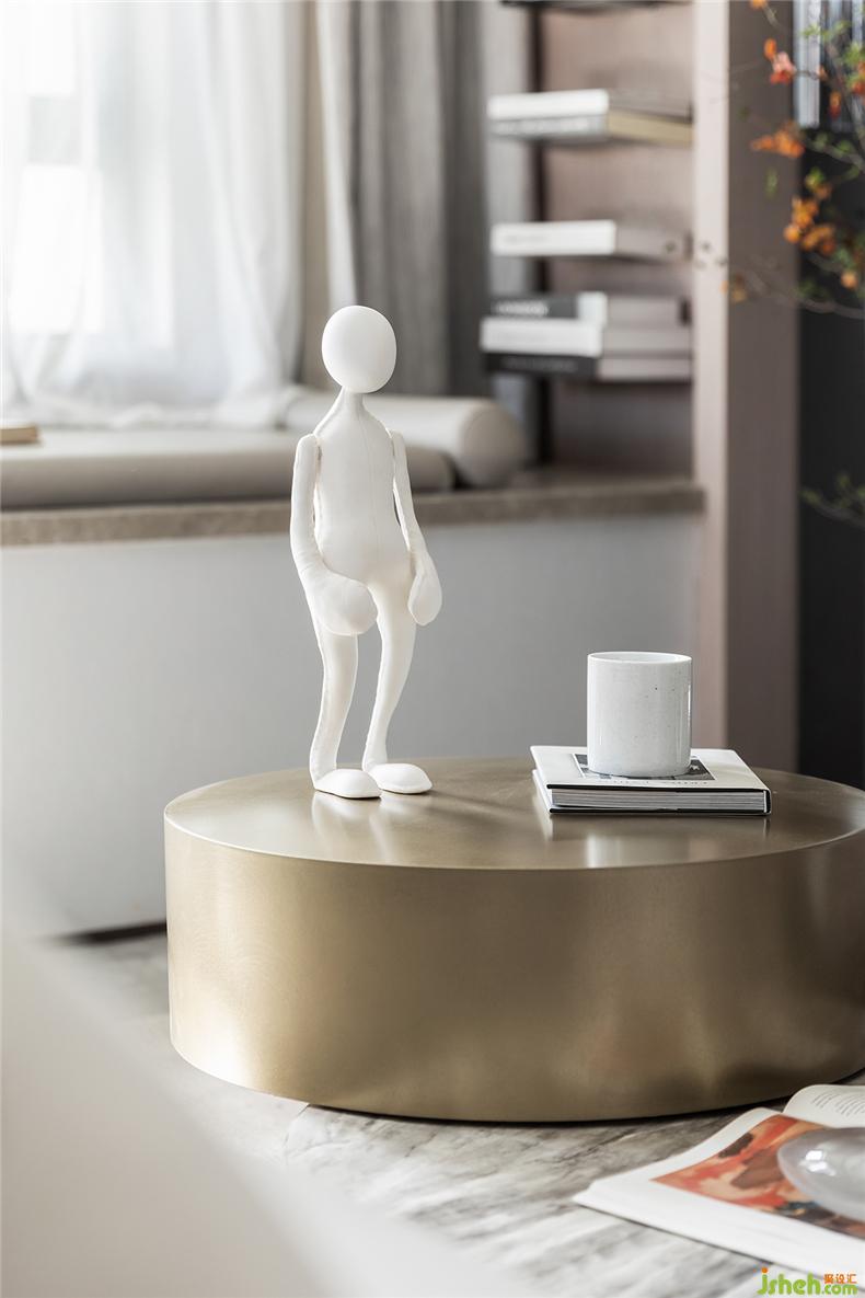 书本、画册,甚至爱不释手的白瓷水杯、人形模具,在金色的台面上更显精致,样板房设计看似随性而松散的配置,给足了空间灵性和呼吸。