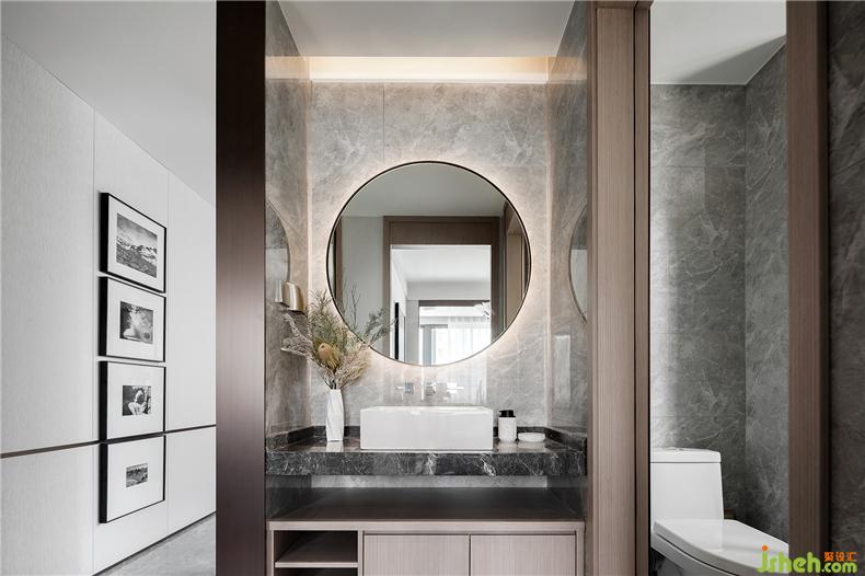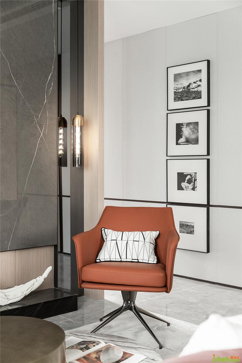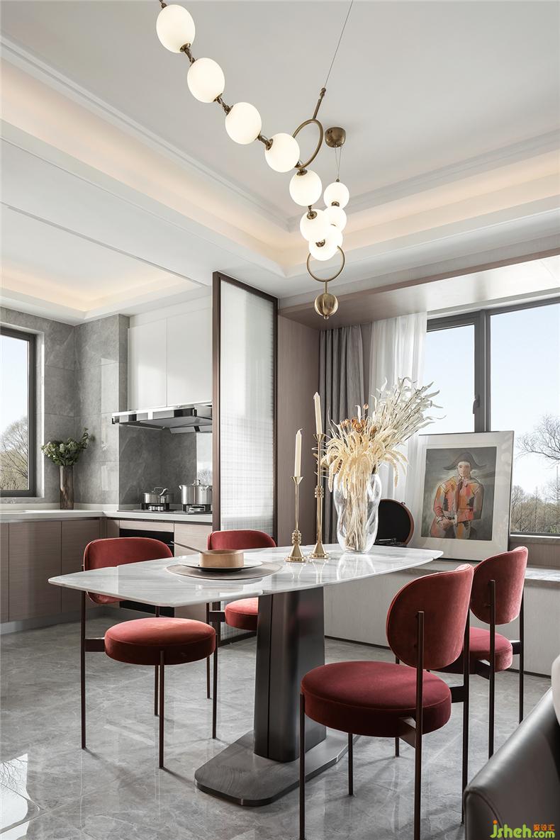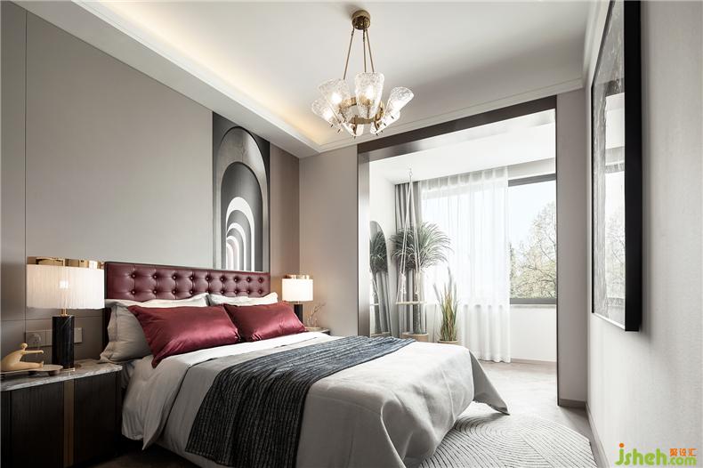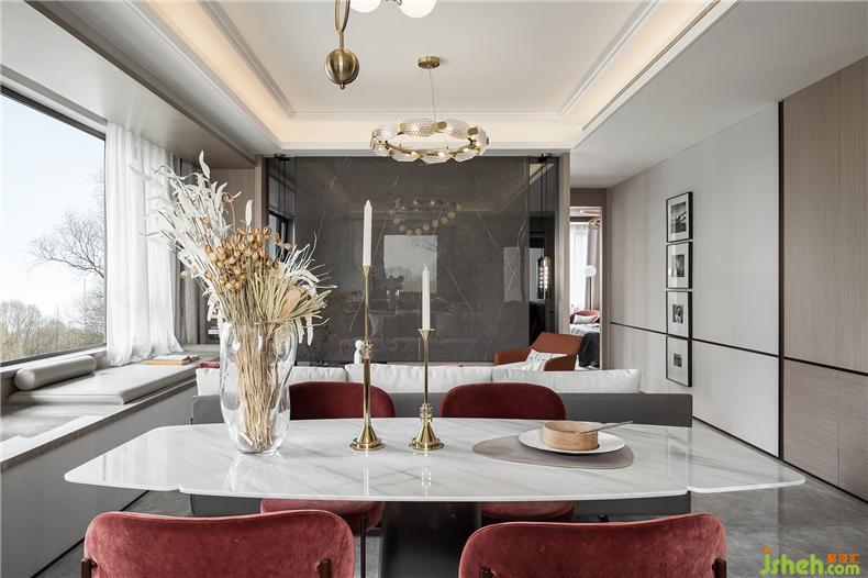 “以张为发,以弛为蓄”,简洁中不失强烈的装饰,样板房设计再强调材料的高贵质感与光泽,明暗互衬,对比鲜明。大面积的灰色大理石与深红的布艺碰撞,浓烈而深沉,庄严而优雅,竟不自觉地让焦点停留。