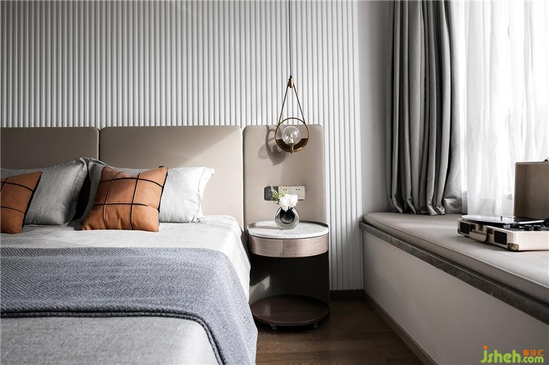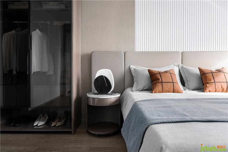 超大的主卧空间,色彩延续了整体空间的淡雅韵味,墙面上木色与白色拼接,简约惬意。作为休憩的区域,设计师似乎在极度摒弃过多的装饰,让每一件物品更显得不可或缺。
