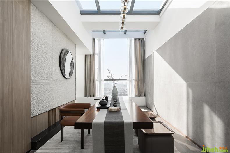 茶室多了几分东方禅韵,和谐的木色奠定了沉稳宁静的基调。样板房设计温厚敦实的木质搭配烟灰色系布艺,质朴素净,浓淡相宜。