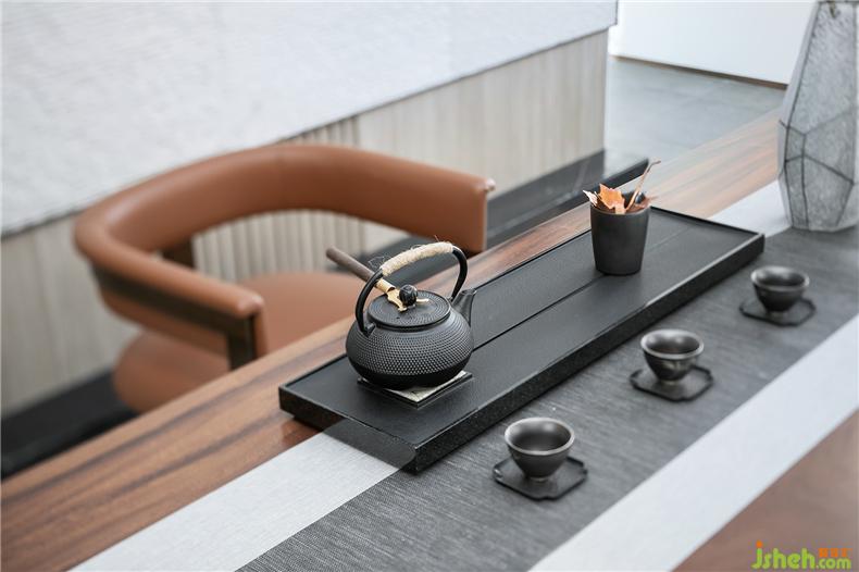 肌理的石材质感,正是空间与自然的交汇融合妙意,契合着水墨山河的挂画,疏淡高远而清丽空灵。这样“和谐”与“冲突”的构思和造意,出于自然,却高于自然。