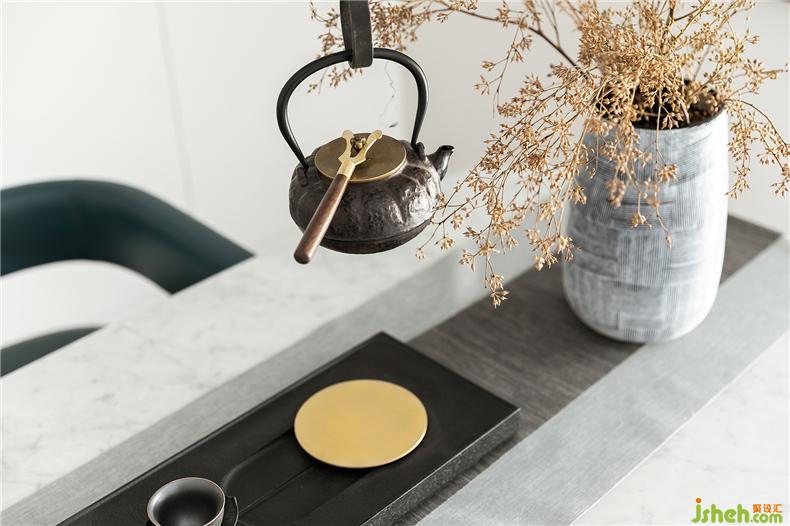 茶室具有一种典雅意境之美,材质的表达,氛围的营造,样板房设计无外不在渲染空间中安静侘寂之美。
