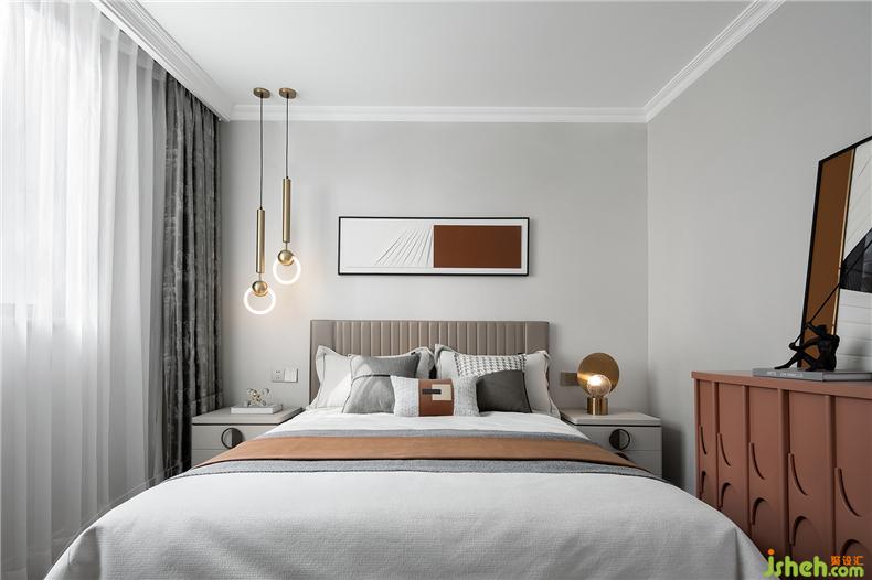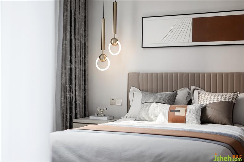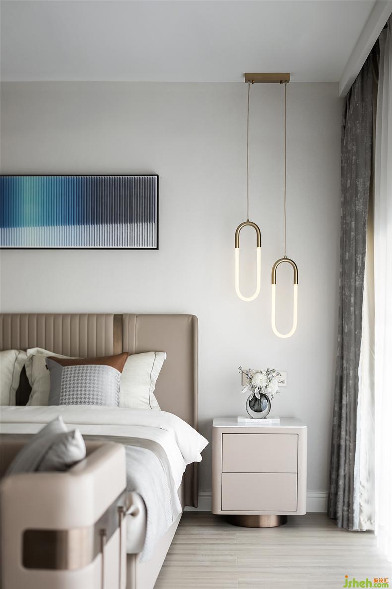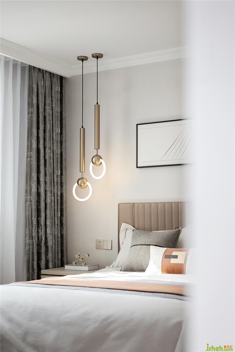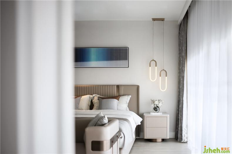 主卧静谧有序,光影在彼此间形成隐隐的虚实关系,简约家居和灯具型体,样板房设计构造出静默安然的视觉感受,床尾不可或缺的独立沙发和茶几,提升居室的另一种休闲感。