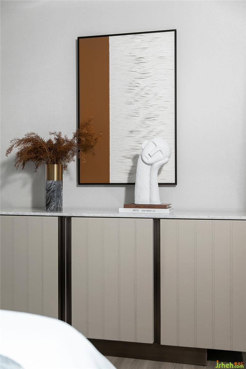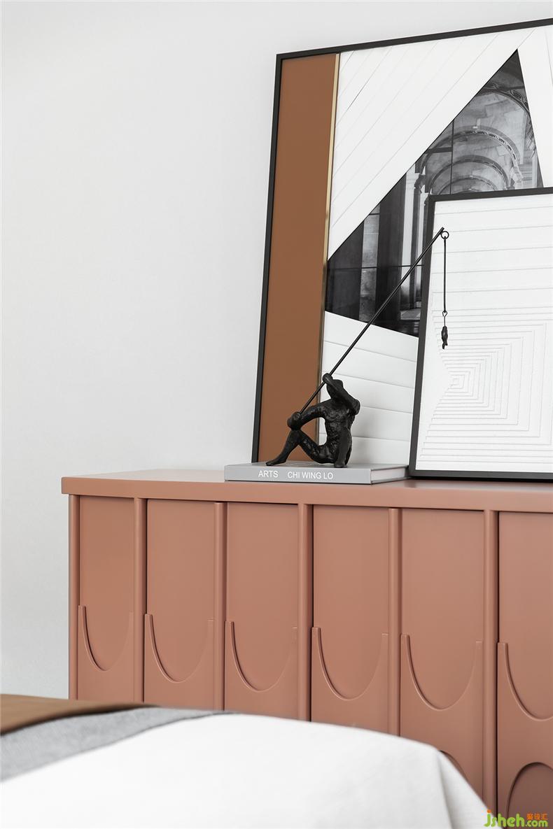 干净的灰白色营造出恬淡静雅的氛围,艺术在其中表现出素朴之道,现代的线条勾勒出艺术情调,样板房设计空间中加入了橘色元素,让空间多了份温暖和舒适。