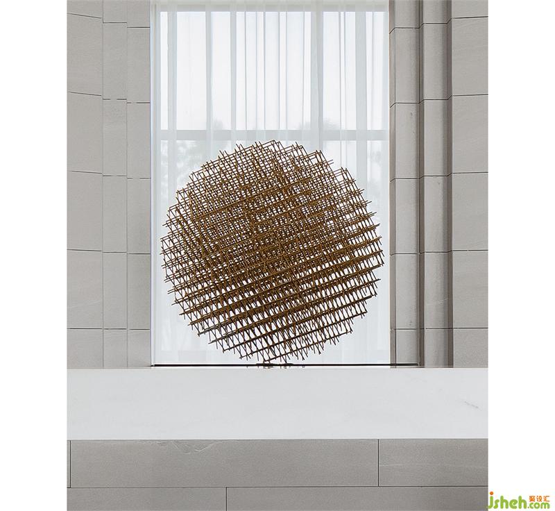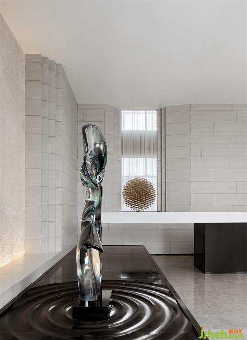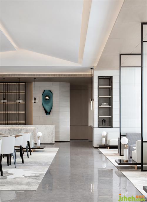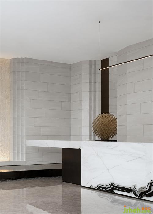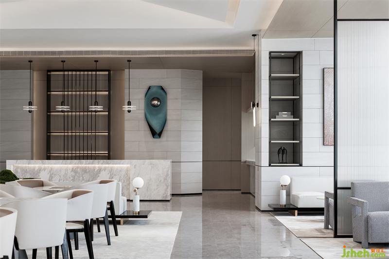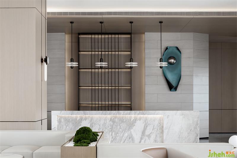 纯粹的空间,泛着淡淡的雅致,石材以干净利落的切角分面,透出现代的块面设计手法。墨绿色的金属挂饰,个性而时尚,彰显空间的高级艺术感。