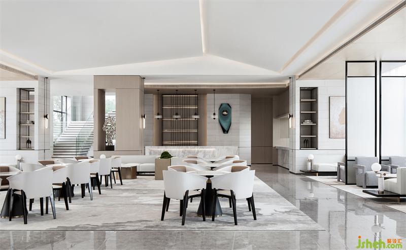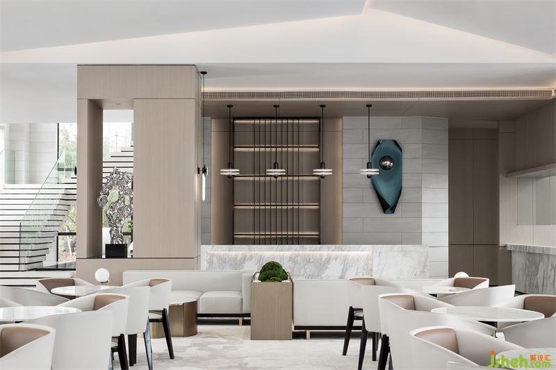 大块面的错落斜顶天花将不平衡动态观感极致呈现, 以现代方式重构传统秩序美, 光线提炼天花块面轮廓南宁售楼处设计,将传统的意向表现得深入细腻。洽谈区的休闲椅简洁轻巧,和天花相得益彰。