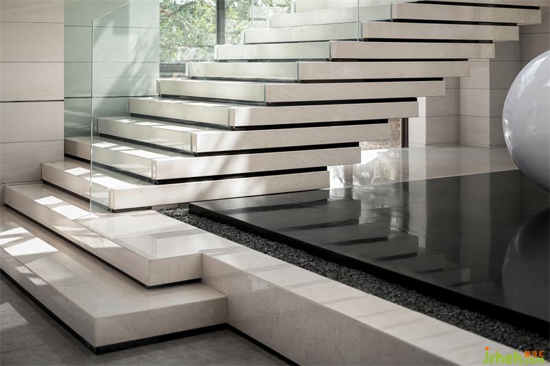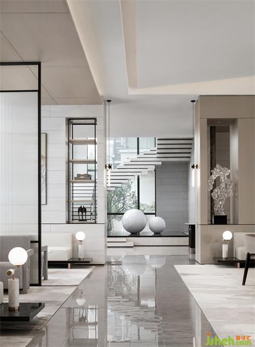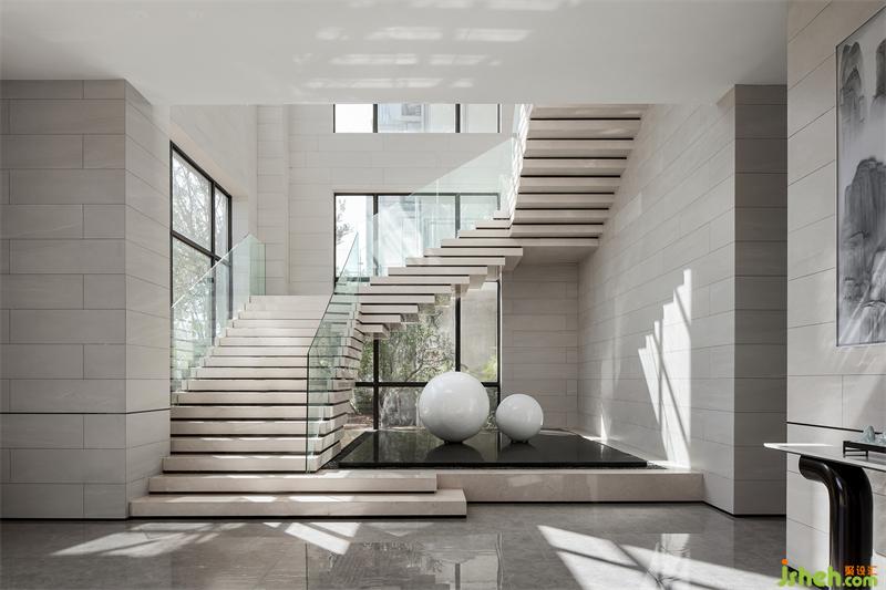 踏步错落有致,层叠而上,现代而又艺术张力。回归东方的人文情怀,营造一方诗境,仿似书画飘逸出古香,静心揣摩浅色清韵之中的闲逸,让传统的余韵浸透现代生活。
