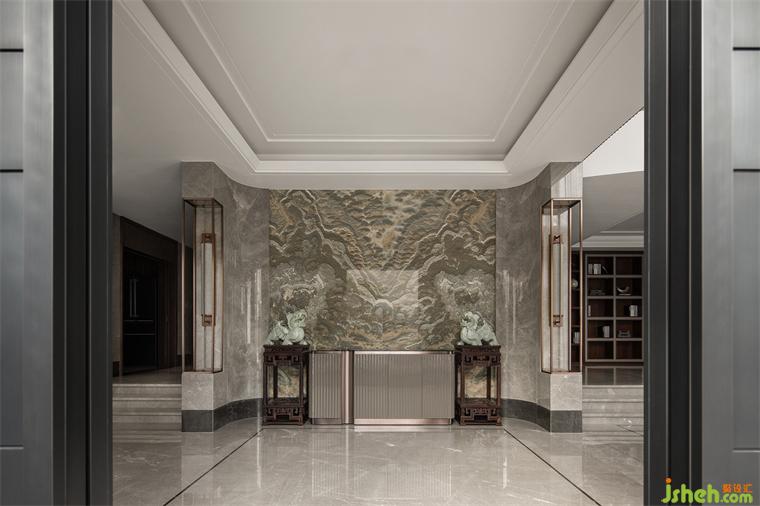近似龙形的吊顶砖画盘旋空中,古朴角几上的瑞兽貔貅摆件,花园别墅装修设计框定空间端庄大气的主基调,营造出底蕴深厚的东方文化独有的韵致,再以雅致浅灰饰面作底,简练纯粹的线条平衡了现代金属的冷硬锋利。