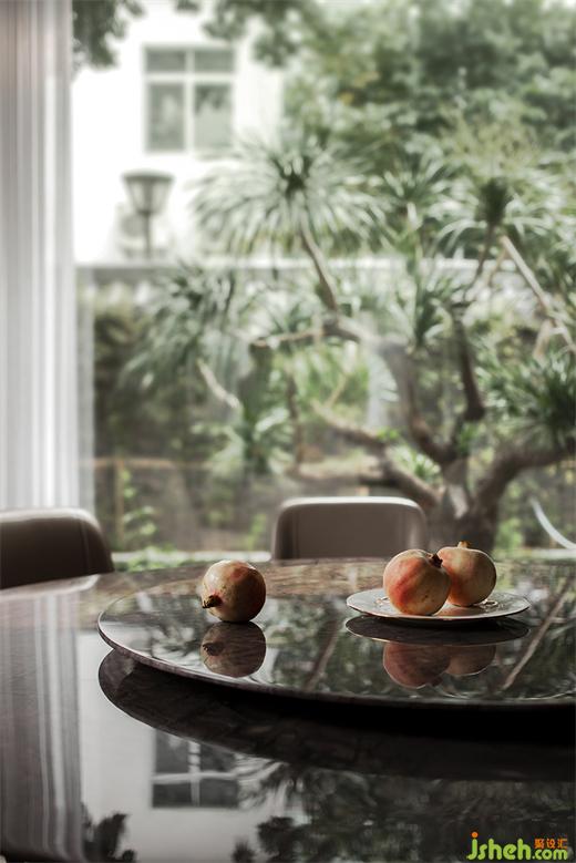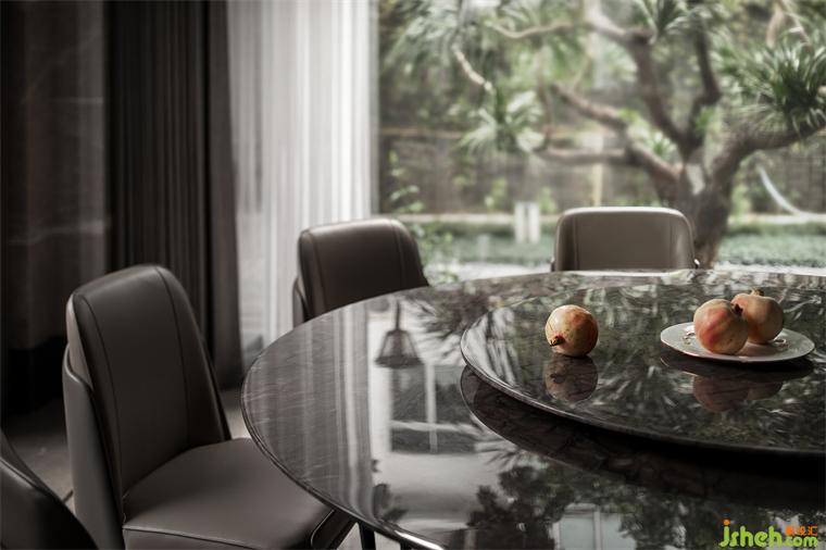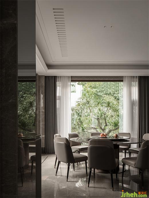 一层中餐厅静享庭院的自然风光,视野开阔,大理石圆桌与哑灰色餐椅的软饰搭配与光影互补共生。