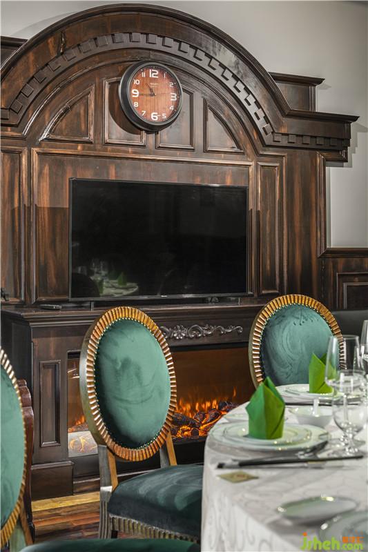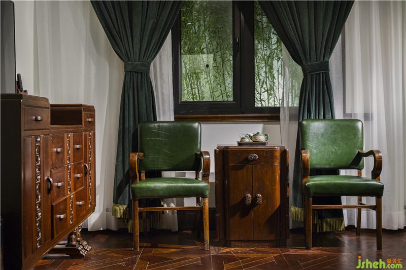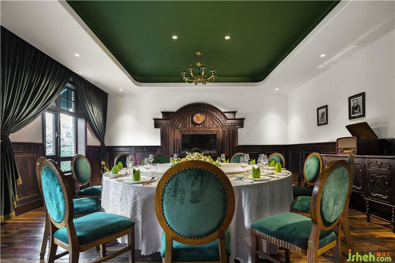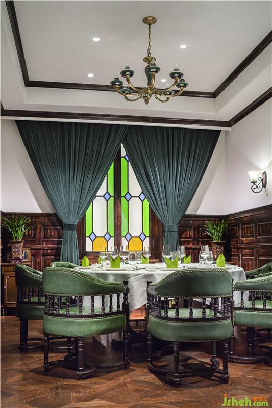 孔雀绿色的窗帘似于绿色的椅子相呼应,对称的窗格花纹,将用餐的仪式感烘托而出。