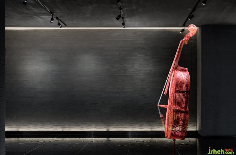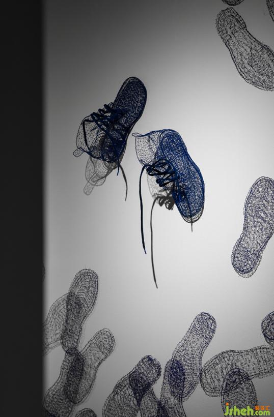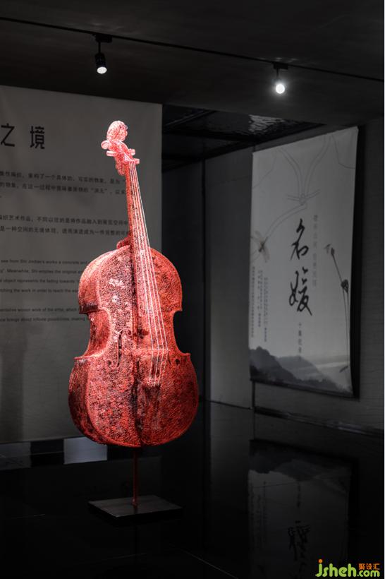 以钢丝编织包裹,成形后取下零部件,再将其组装拼接而成的艺术品在空间奏乐。