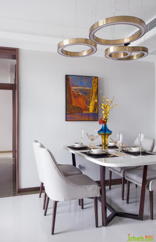 餐厅是客厅部分的延伸,弧线形倒角设计让就餐氛围变得更为融洽,挂画与花艺相呼应,让整个就餐氛围变得活跃。