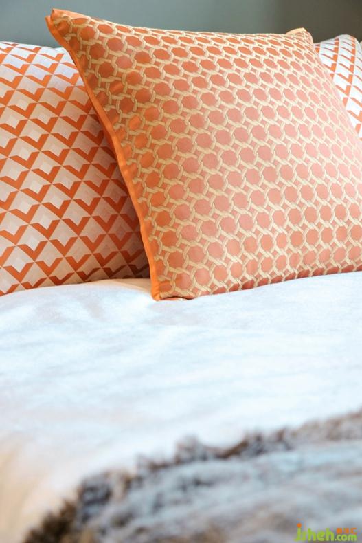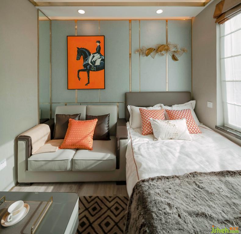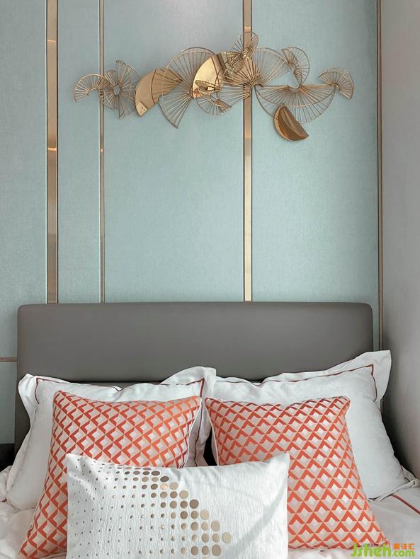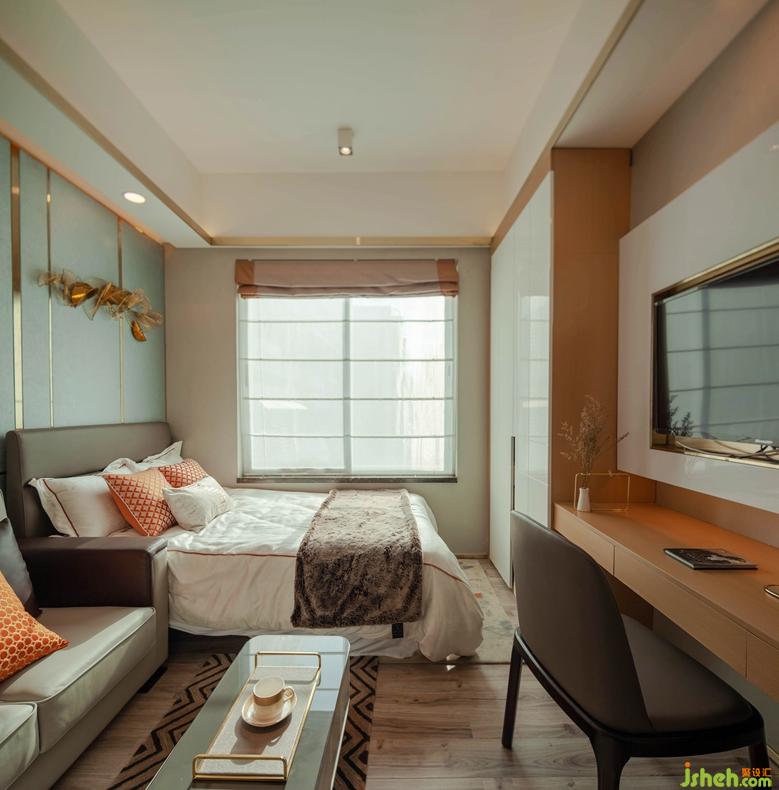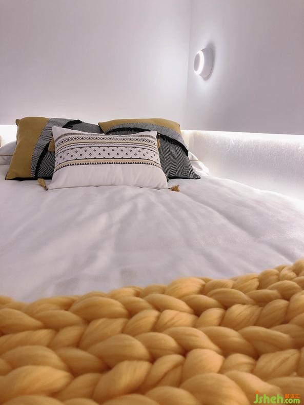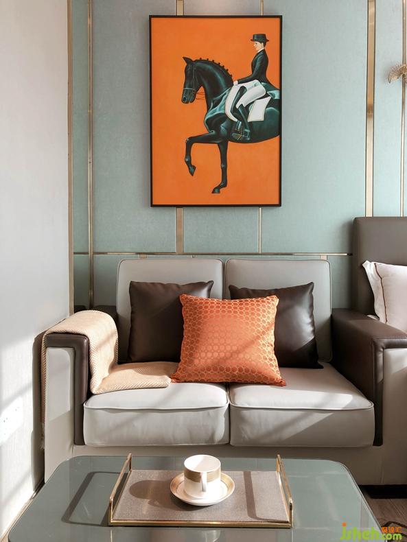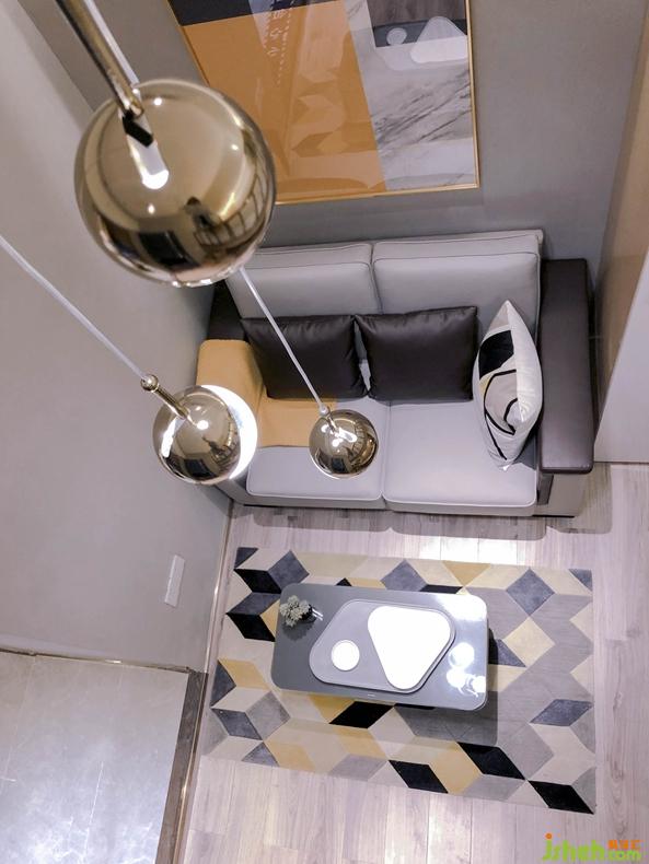 皮质沙发、抱枕搭配着简易茶几,灰蓝黄的毛绒地毯、简约大方、更耐脏。