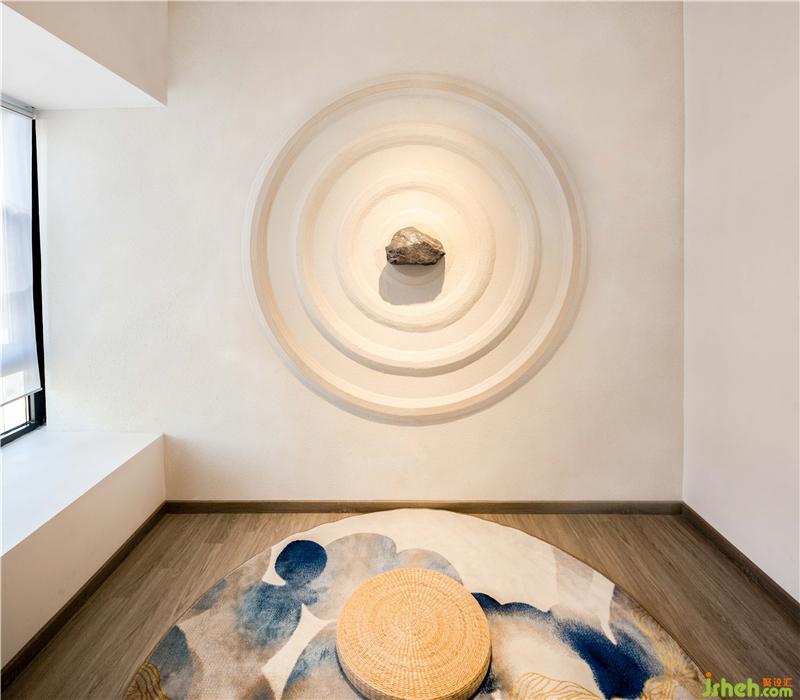 黑色异形石子,简洁,而予人遐想境界空间。周边细沙由中向四周散开,宛如一颗石子落入水中所显示的涟漪。