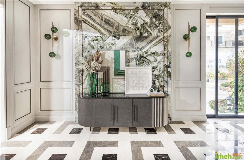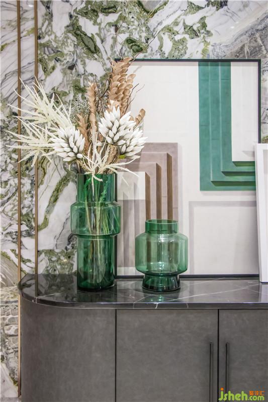 高级而富有质感的大理石纹作为背景,几何立体装饰画搭配出丰富层次并且多样的质感。样板房设计