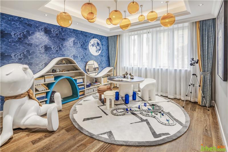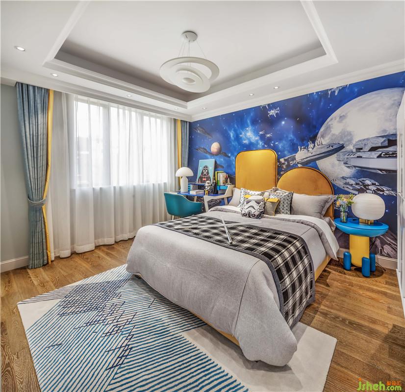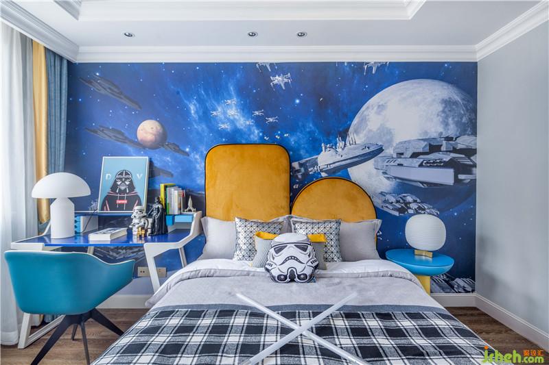 相较于其他空间,儿童房的设计充满了活力与想象,外太空壁纸挂满整个墙面,与各种科幻元素的结合,让孩子沉浸在自由想象的世界当中。