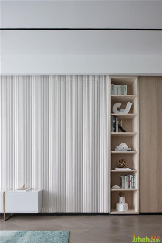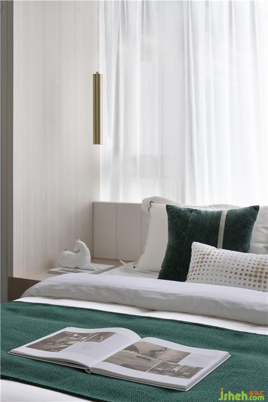 我们通过木地台把榻榻米抬高的做法,样板房设计让床位和床头柜可以恰如其分的嵌进飘窗里,改变床位走向的同时,把床位定格在了一个迷人的高度。