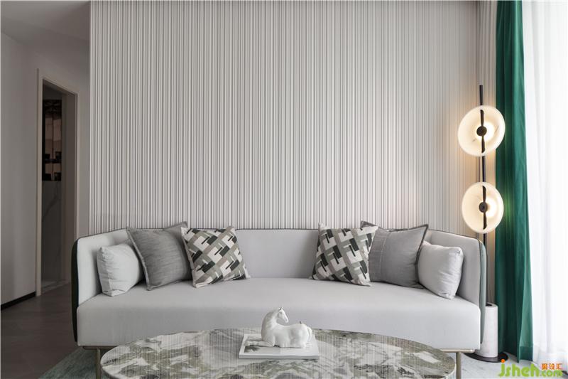 客餐厅最鲜明的痛点莫过于厨房的开门位置太过于接近客厅,样板房设计为了保持空间整体的一致性,同时对各功能区作出划分;