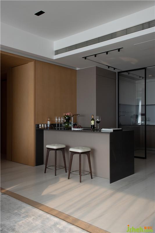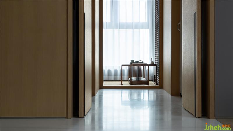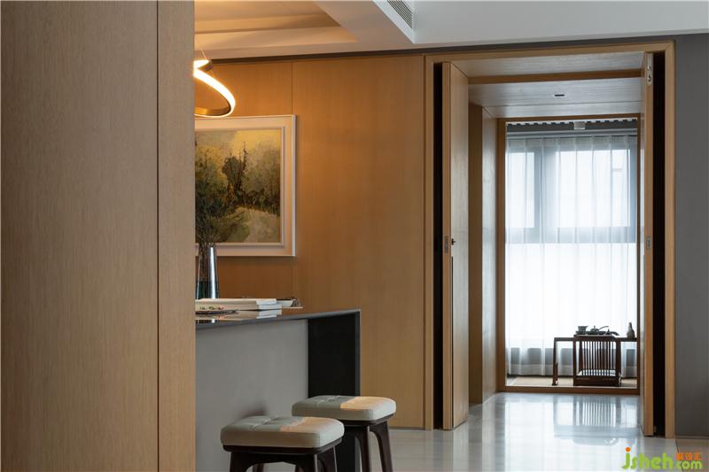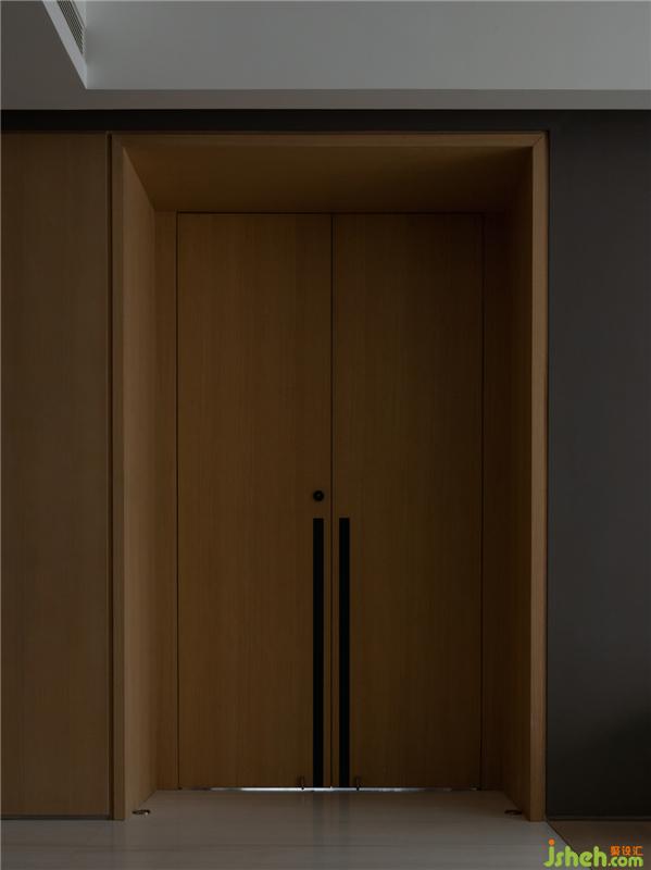 在入门处,从电梯厅走出,可发现鞋架与空间浑然一体,豪宅设计师特意地将鞋架抬高,便于房主进出门脱换。人为地将鞋柜木饰面与墙面统一,简雅而不失格调。