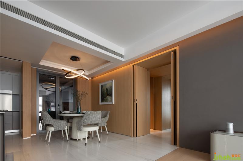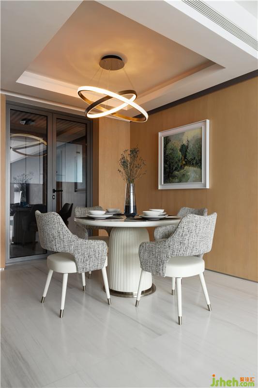 餐厅作为家庭情感交流的重要场地,减去了繁复的装饰,天然木材和白色大理石圆台桌营造出融洽舒适的生活意向。在就餐的同时也构建起了人们的各种想象,提升了生活情调。