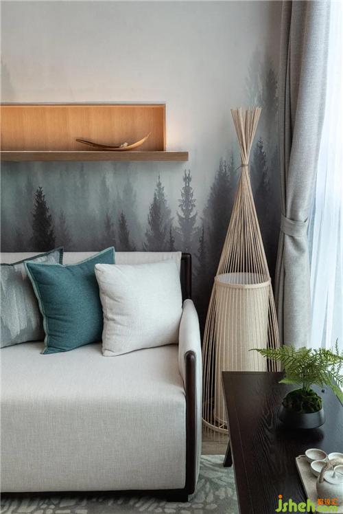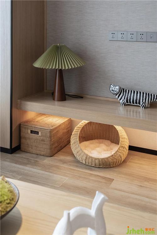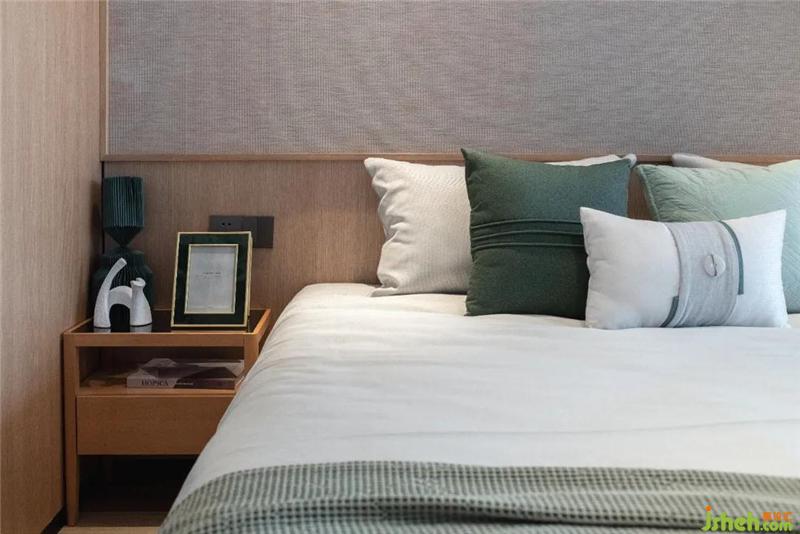卧室的背景墙采用淡黄色的藤编织物,与清雅的绿色调床品形成对比,不论是色调还是织物都不约而同营造出了舒适慵懒的氛围感。