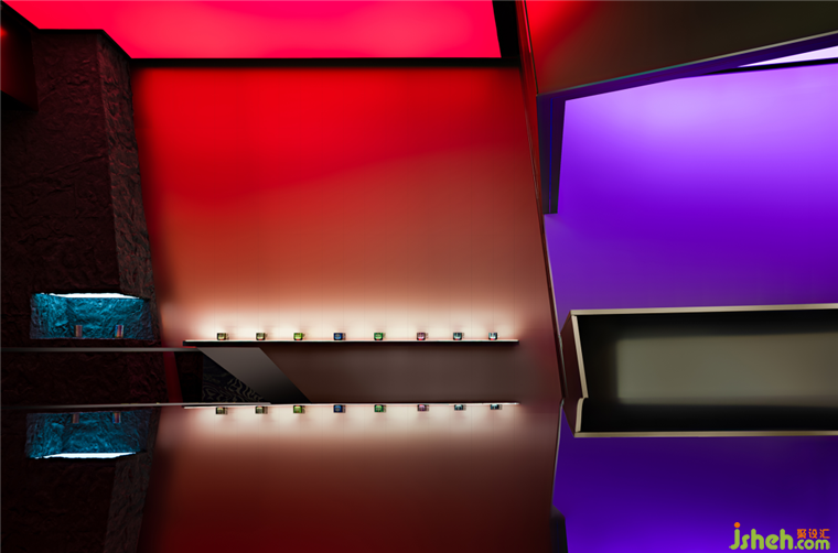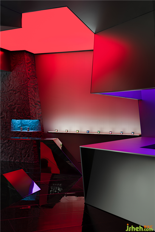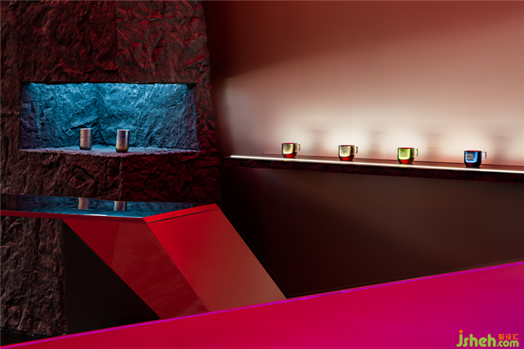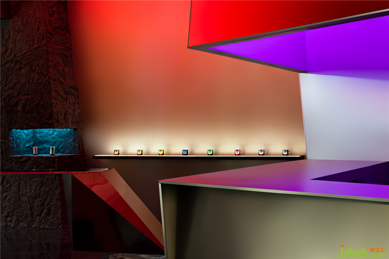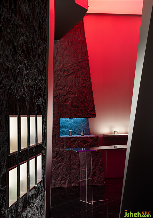 空间基于平面功能从外部挖到内部,不断刀劈斧凿。展厅设计形成矿洞般的空间体验。材质由外部自然粗糙的石头过渡到夸张凌厉的金属,隐喻着钛的提炼进化过程。