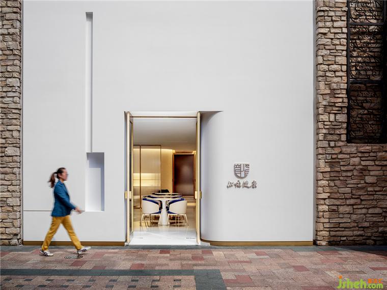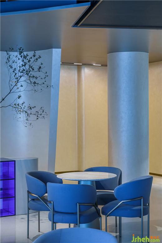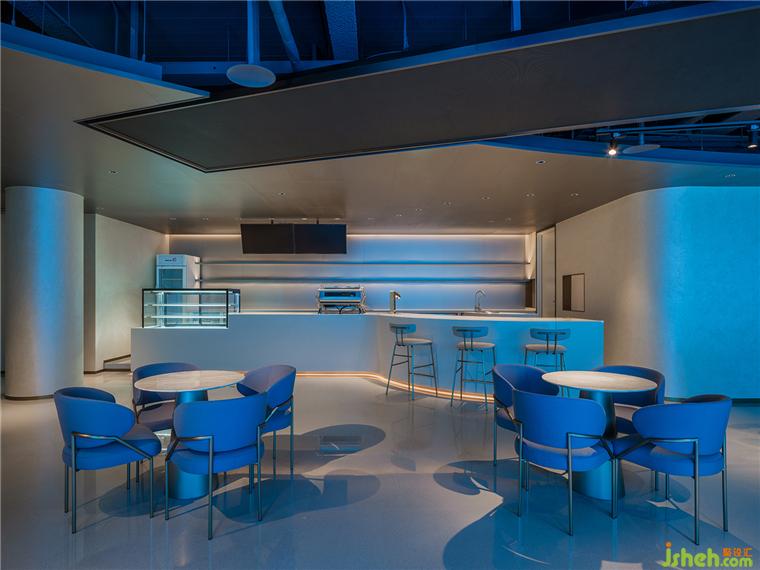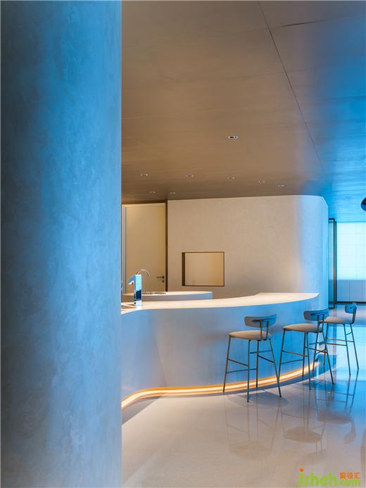 空间材料仍以简洁清晰为基调,纯白色曲面墙向内弯曲,健康设计将视线引入反光的金属色内部,与蓝色港湾园区粗粝的砖石地面构成令人眼前一亮的反差。