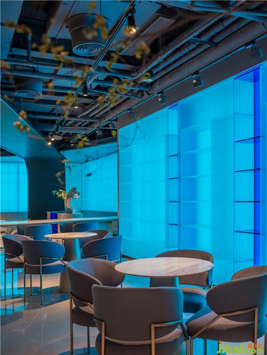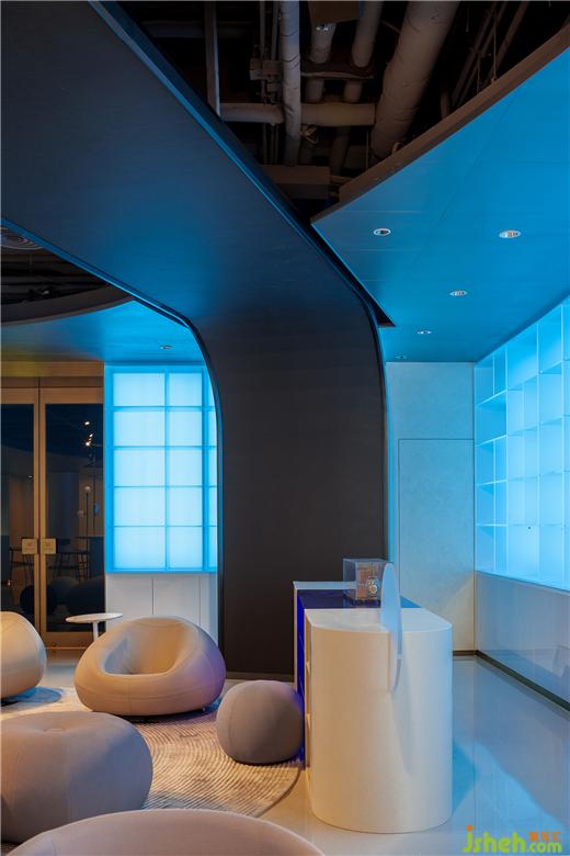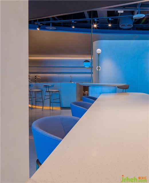 进入内部,富于动感的流线结构自天花蔓延至垂直空间,色彩与材质将层次拉开并在主落座区延展视线。蓝色灯光将整个空间拉入海洋场景——黑色裸装屋面带来酷感,又渲染出海洋与科技的深邃艰深;巨型带状LED屏在顶部和立面环绕流动;健康设计透光展架梦幻迷蒙,向无限深远处弥漫;展台、座椅是凝固的岩石,白色泡沫与蓝色海水冲刷内部,激荡出一个变幻莫测、宁静与活力共存的多元空间。