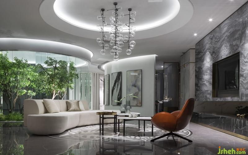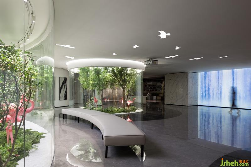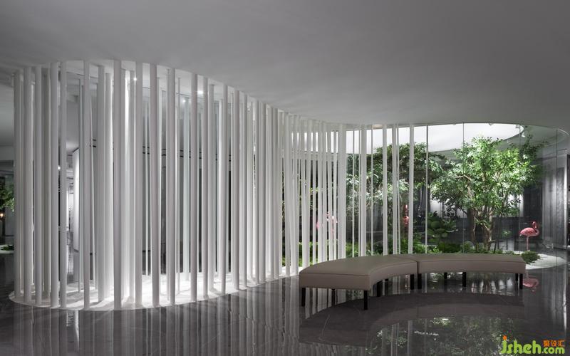 圆形地面与天花呼应,体现空间的张力与灵动,以森林姿态围合空间,生动的流线元素,增强了趣味,缺失的正方体块的洞口,既暗示着每一个未知空间的开始,又使空间相互渗透,进一步突出设计主题。