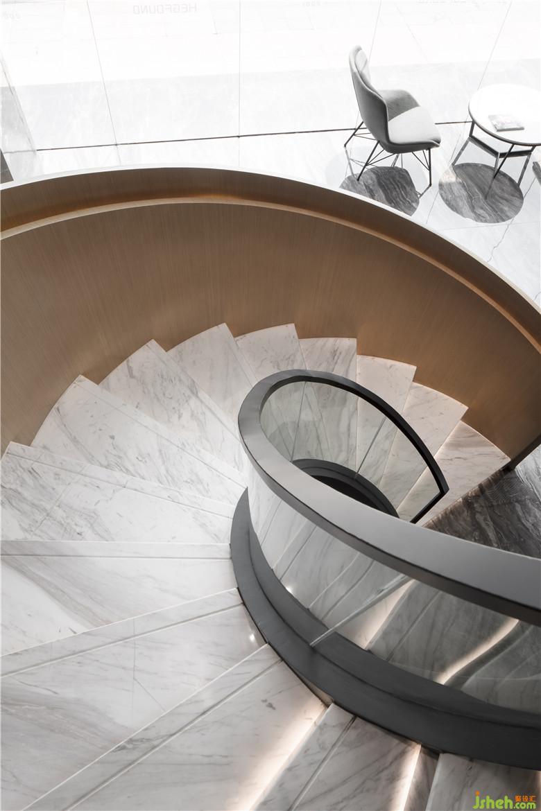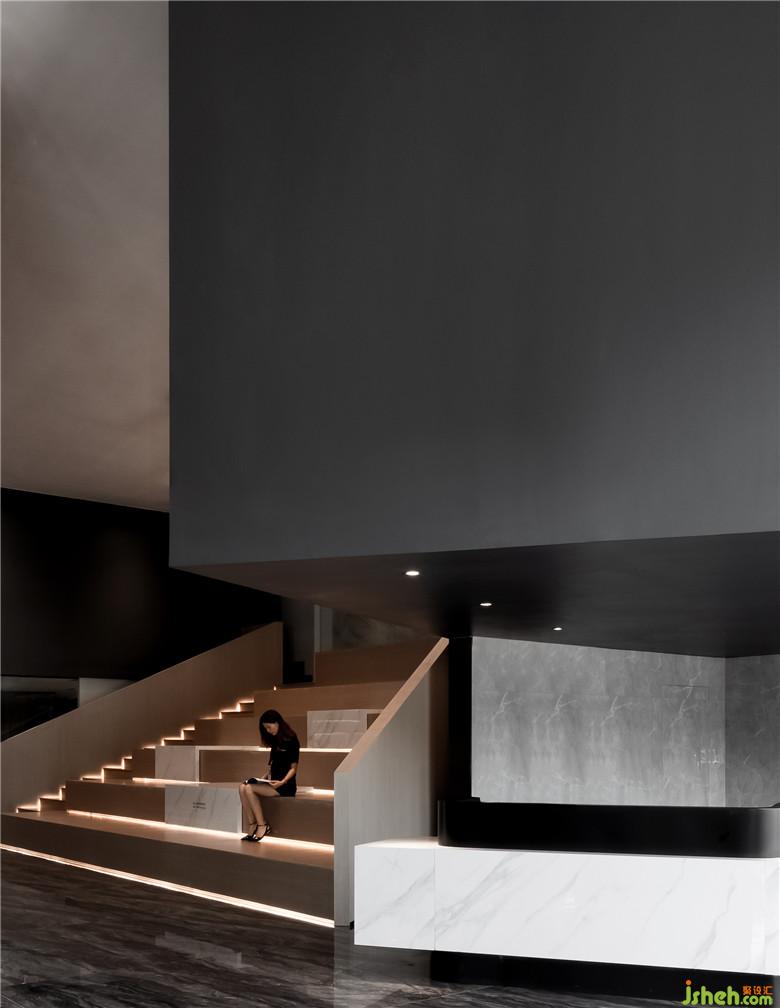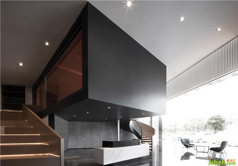 洽谈室在设计上做了独特处理,利用斜插出来悬挑的盒子体作为建筑构造,使空间独特而富有张力。用扇形的阶梯空间连接左右两边的盒子结构。使空间相互交错,互相呼应,温润的木质材料与冰冷的大理石地面相互碰撞,浑然天成。通过屋顶焊接工艺,将盒子结构悬浮于空中,颠覆人们对于力学的常规感受!