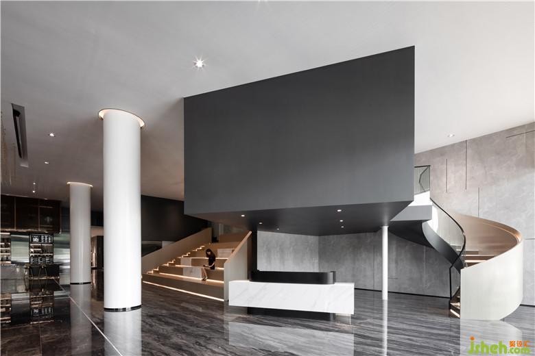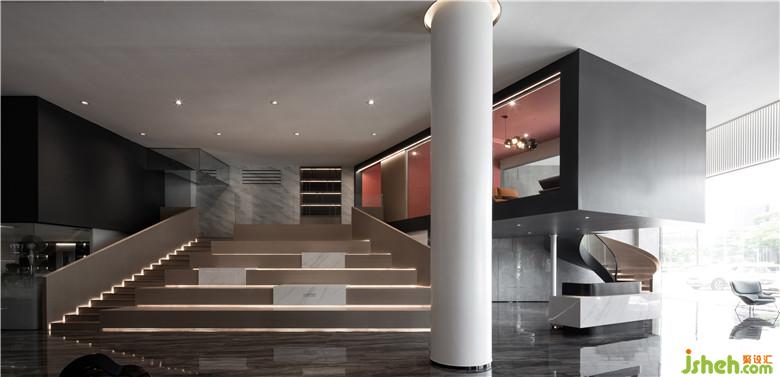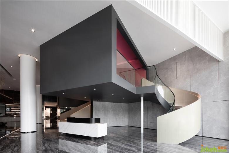 恒福陶瓷企业是佛山具有悠久历史的本土品牌,整体一楼层高近六米,在空间高度上具有极好的优势,我们充分的利用了这个优势,用建筑语言对空间进行了改造,通过几个挑空的盒子穿插,营造一个复式空间结构,使空间具有建筑立体属性。所有功能对应的空间几何在挑空区域交织,使空间和人形成一个极具张力的对话,进而完成空间的独特性。