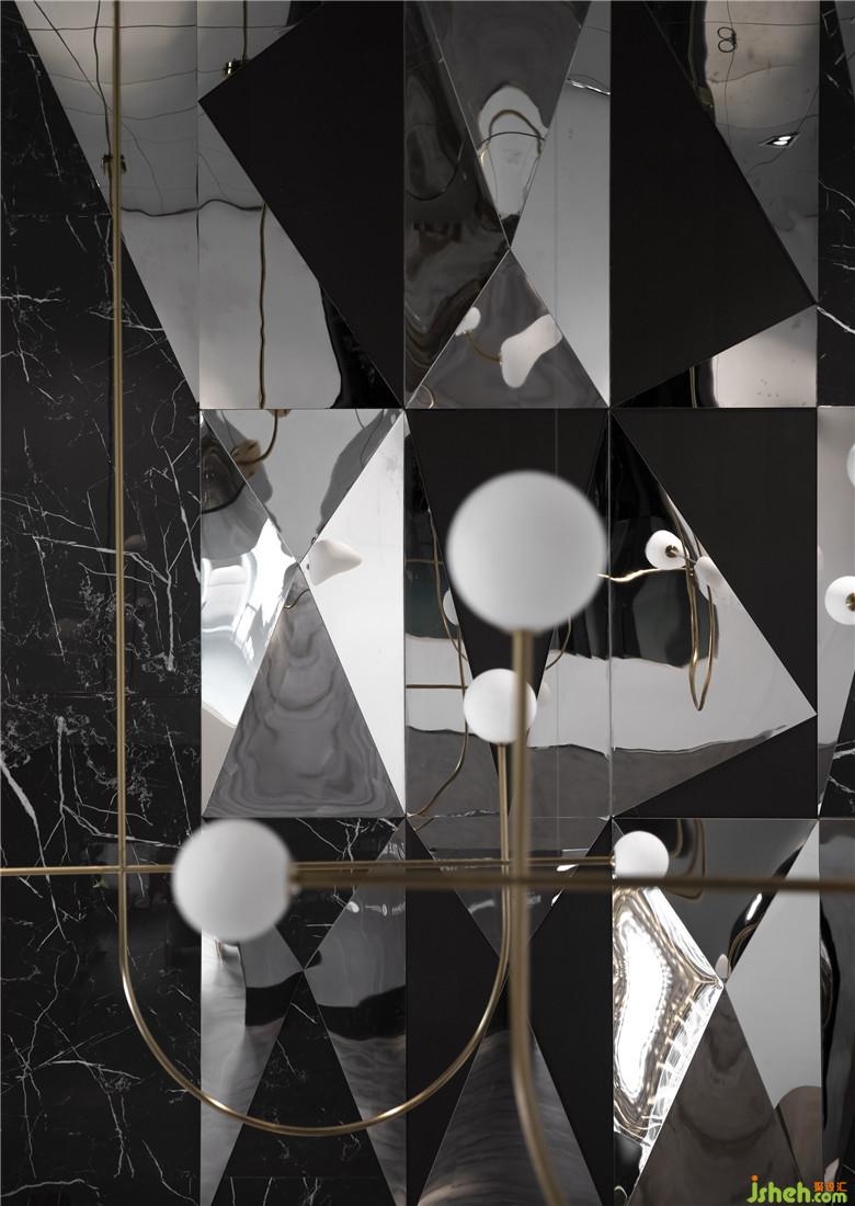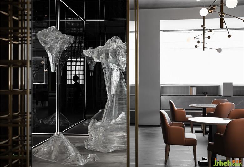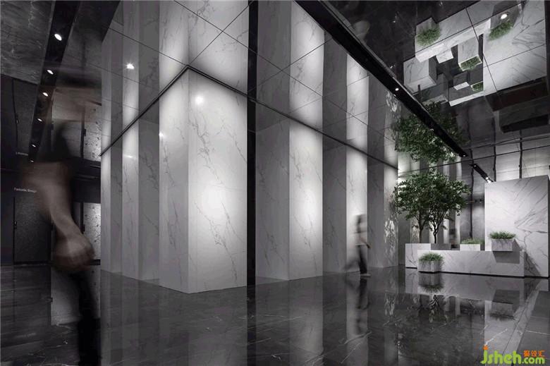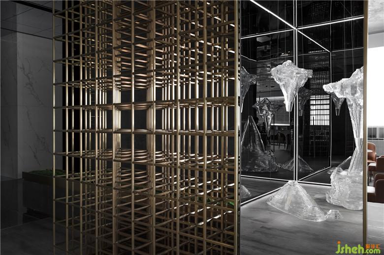 这种动感气息延续至艺术装置区,倒锥形的定制玻璃钢悬浮空中,经由天花镜面、墙面灰镜和地面反射,制造出犹如宫崎骏“天空之城”中虚实交错的未来奇境。而由十二根柱子以三行四列矩阵排布的一座“迷城”,借助LED屏呈现海底、星空、树丛等沉浸场景,多维五感体验恰似“城外的人想进去,城里的人想出来”。