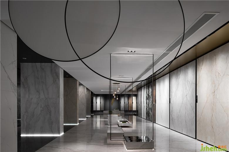 展示区以陶瓷产品为核心,通过疏密有致的几何体块序列进行叙事。干净有力的建筑语言突出产品设计的简约哲学,辅以柔和的间接照明丰富空间意境。品牌自身形象亦借用几何方块和平面视觉,表达去繁入简的生活态度。方块盒子上划出一个洞口制造视觉惊喜,以戏谑的方式塑造一种理性却不失浪漫的美学。