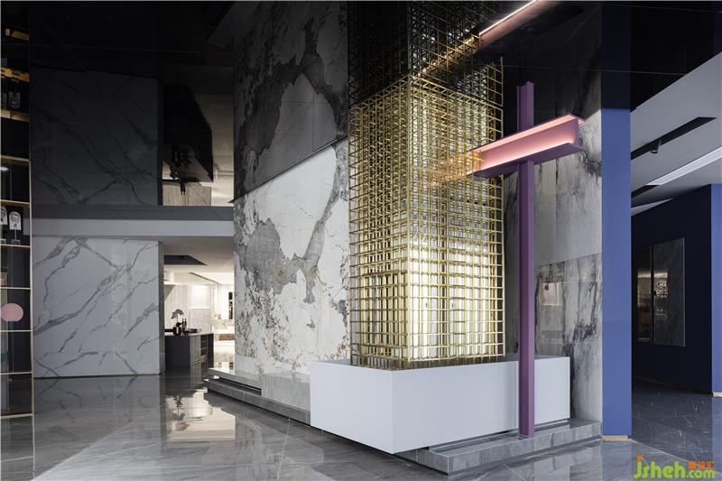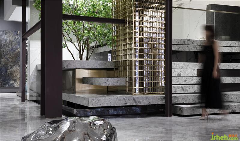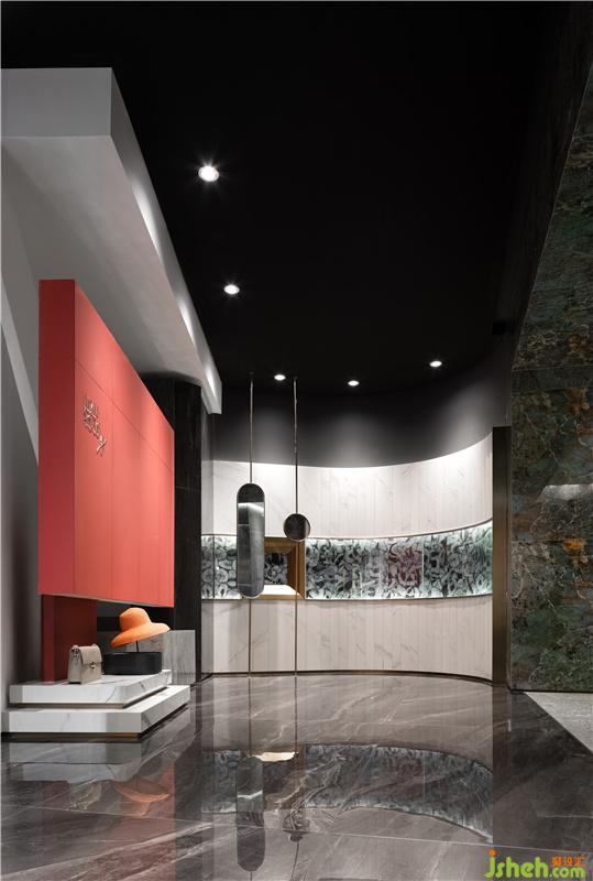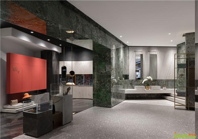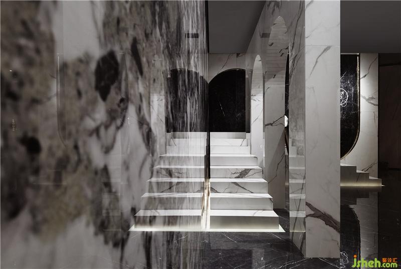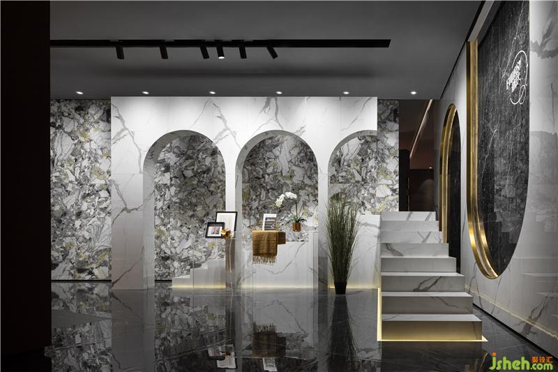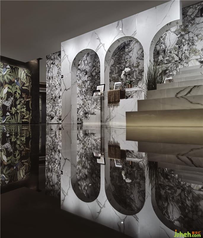 拱形门既是西方也是东方的建筑语言,利用向上的拱形与向下的拱形并置,产生东西方美学的共鸣和冲撞,同时又被赋予产品的展示功能;巧妙地运用透明亚克力板这种现代材料与古老的原始的石材形态进行组合,瓷质台阶从拱形里延伸出来。这种拱形的形态来源于过去的历史建筑元素,却运用现代抽象的设计语言与最基础的建筑形态来表达,使之抽出、混合、拼接。