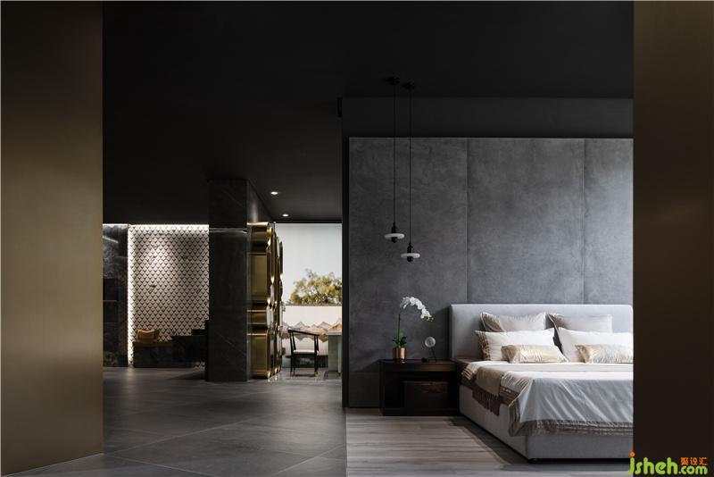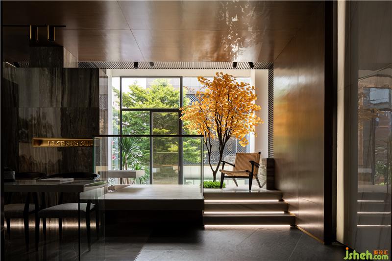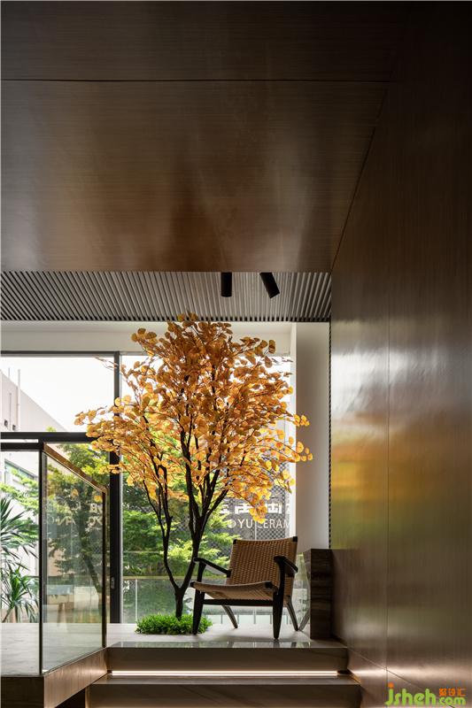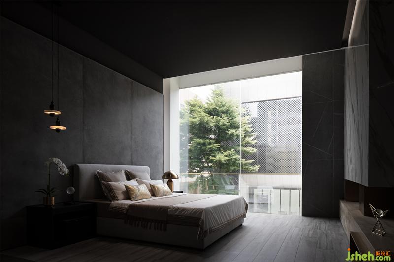 室内空间是建筑的延伸,挑空的阳台和落地玻璃窗为室内空间提供了必要的空间属性,抬高的阳台,园林氛围的书房,宁静自然的卧室,这里是一方享受自然阳光的天地。阳台上枫树,阳光透过金黄的叶子撒进室内,犹如在讲述着一个秋天的浪漫童话,更似乎是朱丽叶的窗台,窗台的绿植和户外的自然景观形成一个很美的过渡空间,设计师刻意营造出一种转角一霎那遇见自然的惊喜,试图重启一种人与建筑融入自然事物的“齐物”建筑观。光影在树叶的间隙中流动,在室内留下自己的叙事语言。
