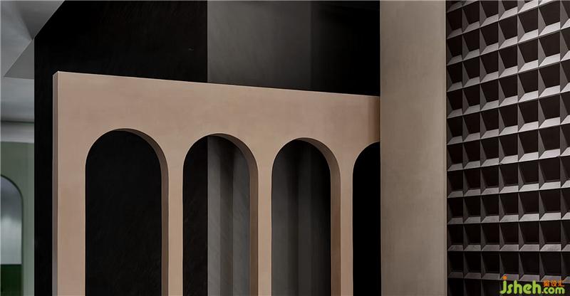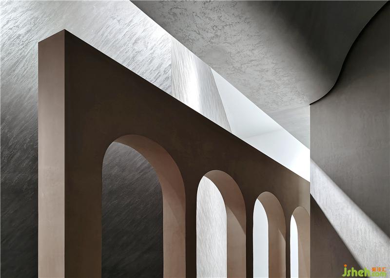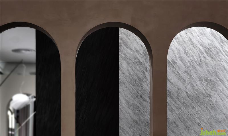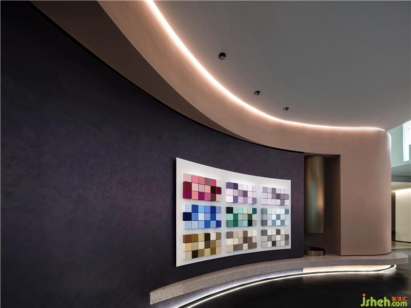 一次不一样的思考,通常是比例、形体、材料、光线,细节来支撑空间,而这次是空间反过来支撑材料,材料才是这个空间的主体,需要表现与被表现的。空间为材料退让,把空间留给人,为人提供大量的交流和互动的机会。自然的白色、灰色水泥质感与黑色菱格质感墙体,几种不同感受的质感有机的融合在空间里。佛山展厅设计圆拱形状成为分割空间唯一物质,与顶部分离,这种空间的延续处理,弧形存在角落的最高点,与人活动的过程都可以若隐若现的对话,更好的强调空间神秘与趣味的精神。意图表现漆的多样性与可以表达各种情绪,让人可以感受空间与材料在呼吸。