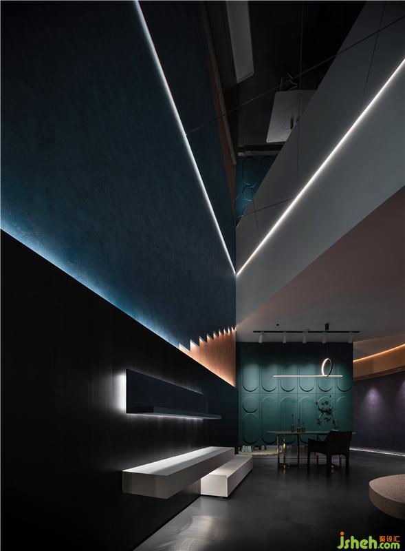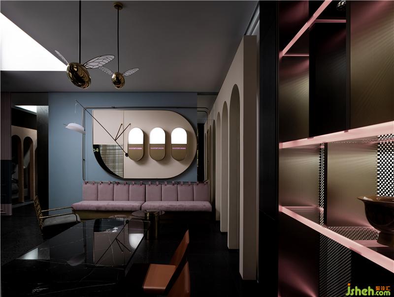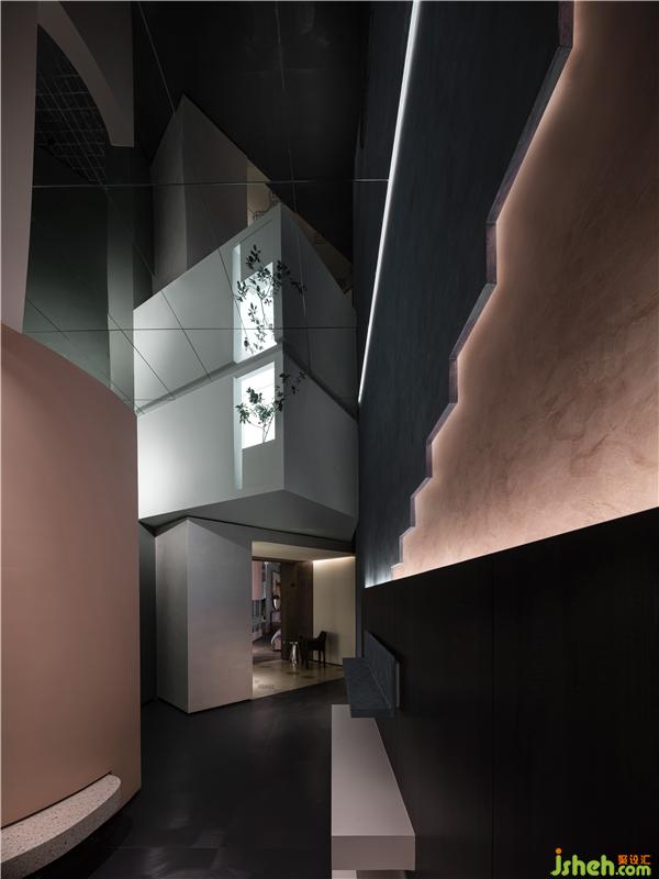 有计划的将空间转折的入口尺度缩小,提示你进入不同情绪与味道的世界,小的口会让你对后面的事情产生兴趣与想象力,光是表现空间情绪的重要介质,光影互相依存,空间中大面积大拉膜,强调光线的柔美均衡,一方面更好的服务于空间中产品的照明,在情感上弱化了影的存在,营造一种戏剧化的安静,局部强化光影,表现材料质感的同时感受空间的躁动,一种压抑着的力量准备爆发。这一次把空间简单的变成美学问题,做一些触动神经的事情。