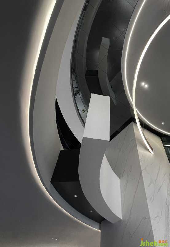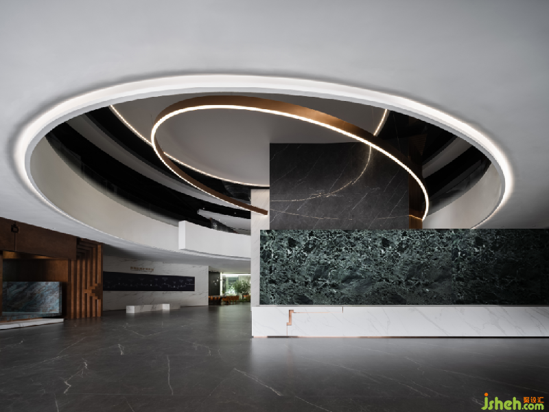 大堂的圆形中空除具有建筑几何美感,也隐含了东方哲学观念的“天圆地方 ”,更表达出一种星球运动的轨迹。环绕线条元素在三维空间里按照美的视觉效果、力学的原理进行编排和组合,营造出“别有洞天“的空间感受。