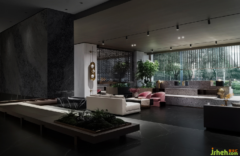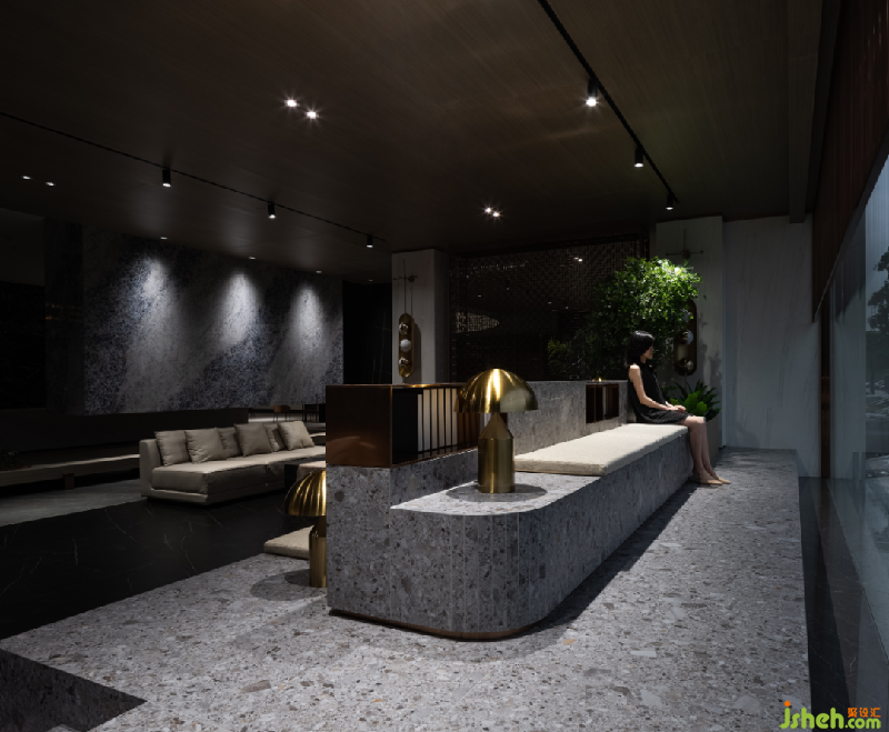大堂吧通过松弛有度的地台设计,营造一处内外有别的休闲场所,向内可以轻松畅聊,向外可以欣赏窗外的景致,水磨石质感的坐台显出自然生态感,金属屏风以及台灯更增加精致的生活品质感,理想与现实于此碰出最相宜的相处模式。