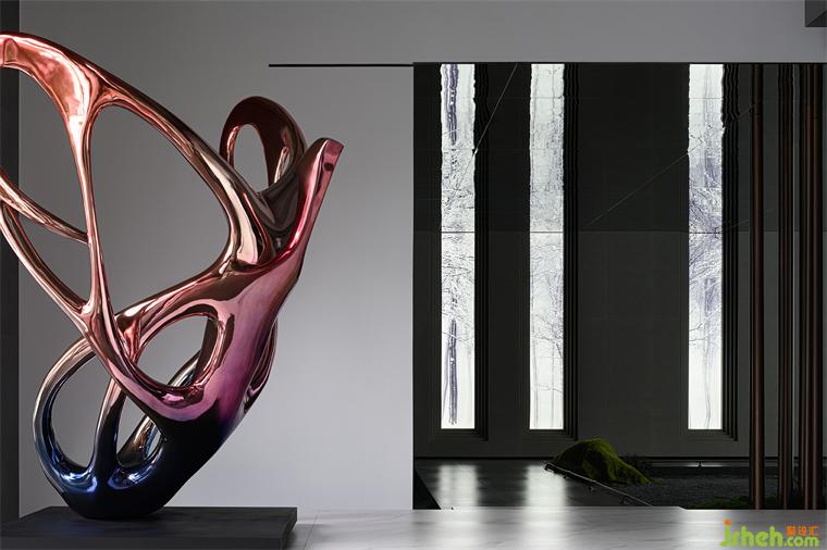 大堂角落幻彩的不锈钢蝴蝶装置凸显品牌一贯的时尚感,深蓝色的奢石前台则展现了品牌的低调奢华的一面。观者沉浸于这个独特空环境中,全方位感受品牌的精致与时尚。