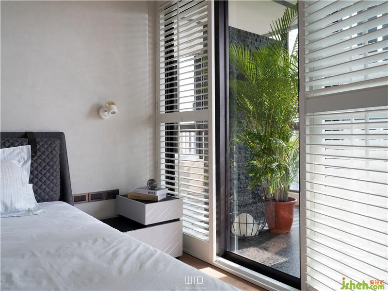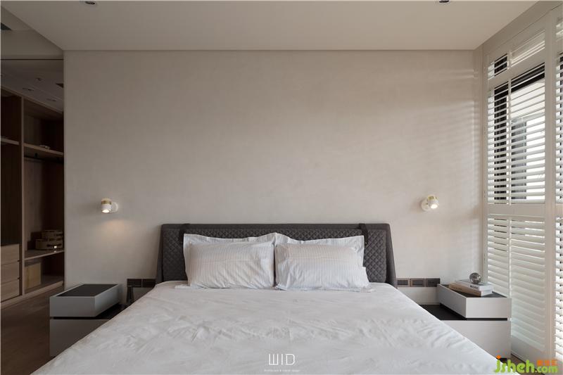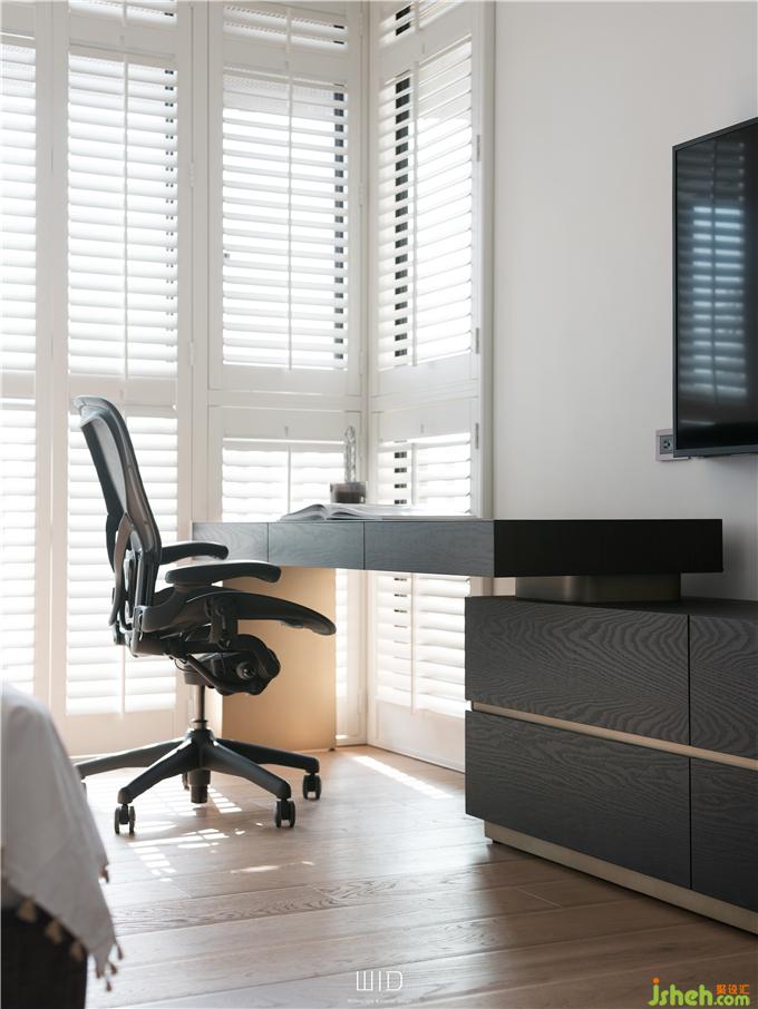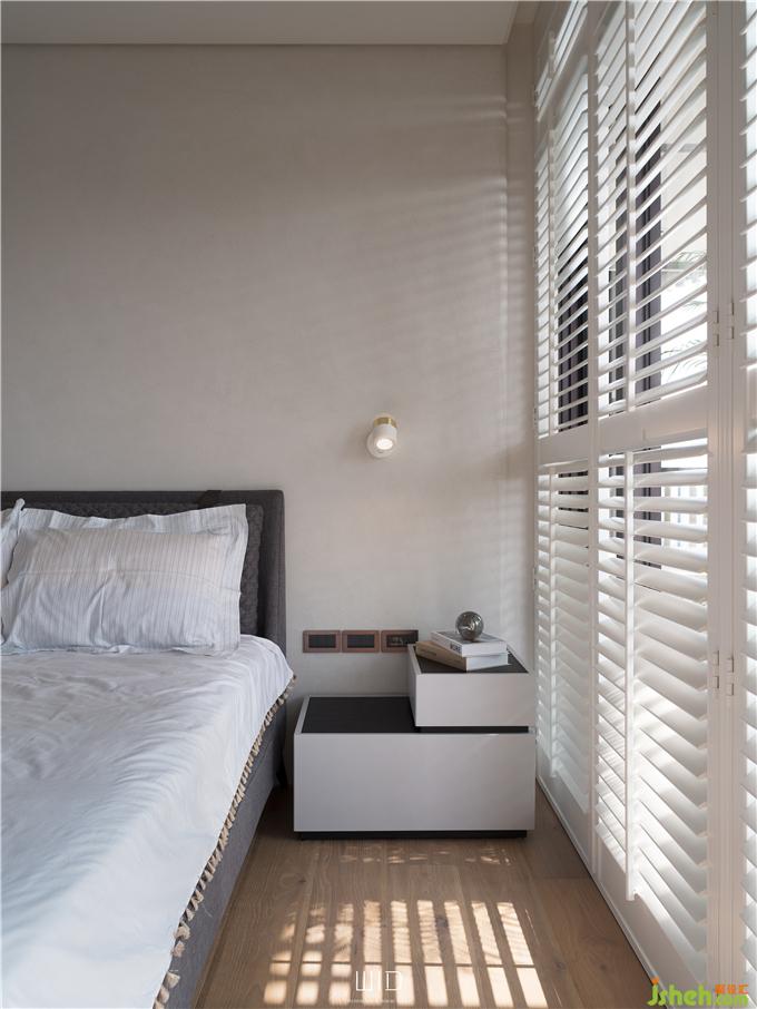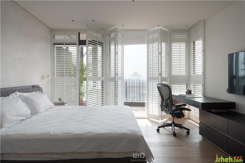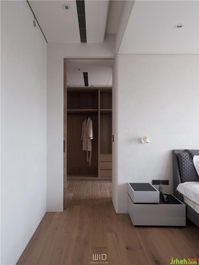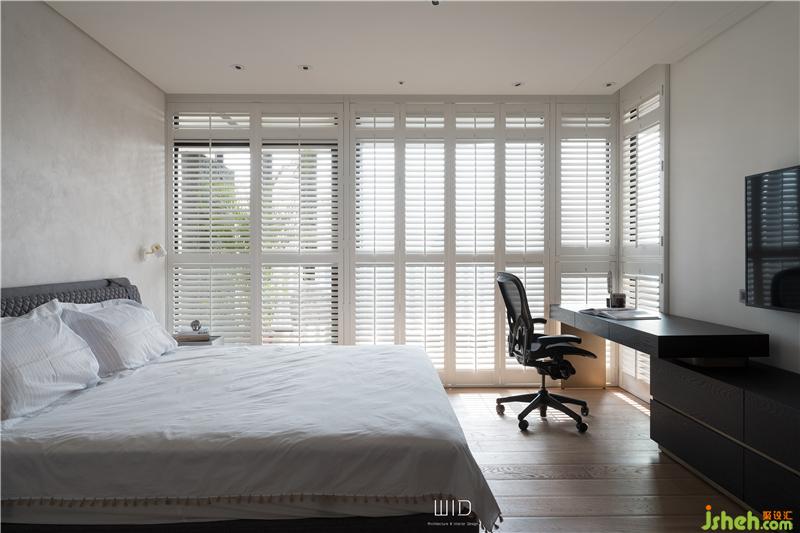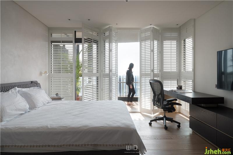 随手拿本好书搭配著手冲咖啡,到户外晒晒太阳,都是生活日常。我们使用了百叶窗,天气好的时候可以全部收折起来,让室内室外合而为一,将窗户关上,也一样有著落地窗的采光与穿透。延伸「白色系」的百叶,将舒适的感觉带进臥室搭配窗外的景和植物,惬意又放松。主臥阳台联通客厅,在空间中可以随性的走动、停留,场域之间没有隔阂。面长的书桌结合收纳功能,运用高低落差增加层次感,木质的颜色内敛沉稳,可以安定人心。触摸墙面各个角度的弧度、质感,在光影之间的轻微碰撞中倾听清脆悅耳的声响,跟著线条一起走进了更衣室。