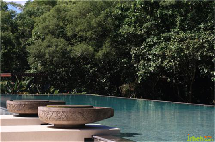 泳池酒吧结合岛国传统凉亭特色,运用的木材、石块和藤条散发出大自然气息,篓空木头疏密有致、错落有序 ,消融了室外与自然的隔阂 。藤制椅打造轻盈热带气息舒适且通风,利用玻璃天花打造了温和的阳光,坐在那里,可以无边际泳池为背景,将郁葱葱的林地美景一览无遗。