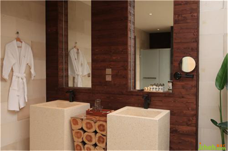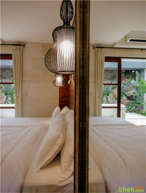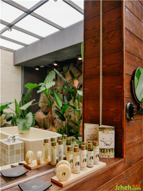 床舖旁采用透明木制拉门,巧妙与盥洗空间链接,视觉更开阔。将原有的石墙纳入设计概念一部分,通过粗犷的质材和层叠赋予意义 ,用现代的设计语言重新定义旧有的形式。浴缸两侧更种植著栀子花树和精心设计的植栽景观 ,外加具有当地特色的挂饰加以点缀。大器开放式浴缸加上大量的采光及植栽景观,洗涤都充满自在朴实的仪式感。