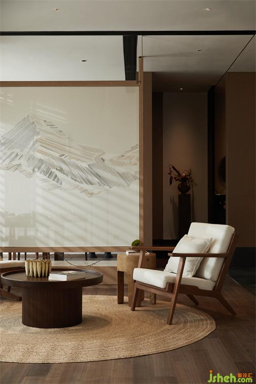 As a relatively dynamic clubhouse and experiential area of the town, the designers have divided the space into aromatic regions with a focus on 'flowers' and experiences, a 'tea'-themed social living room for meetings and socialising, and a 'food'-themed "The 'food-themed private dining room. The three different spatial areas are unified in the same system by their interconnected moving lines, and extend to their respective courtyards.