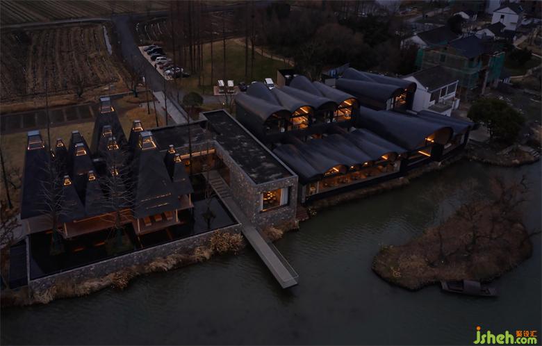 在苏州吴江区的善湾村,田园村落的宁谧、河水的幽幽宽广与历史文脉相融。船坞酒店便坐落于这悠扬空间的风景之中。波纹般起伏的黑屋顶建筑群落,犹如聚集起来停靠岸边的乌篷船,时而婉转悠扬,时而宁静动人,成为岸边水墨画卷的点睛之笔。