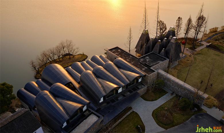 一方浮岛,枯木几棵,恣意伸展之间如同迎接,细述着时间的过往。酒店建筑与周遭的自然景观融为一体。酒店设计高低错落的圆拱形屋顶形成聚落,如同山峰迭起的水岸边停靠的艘艘船舶。