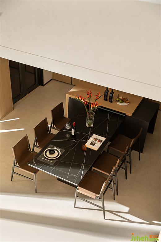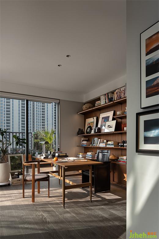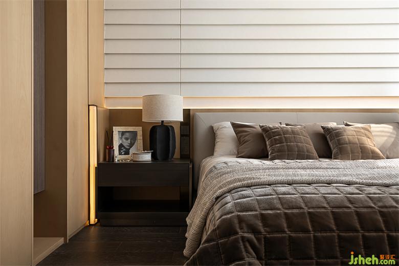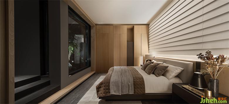 步入下沉式主卧,柔和的微风扬起窗纱,使视线正好平于庭院景观。万科样板房设计延续会客厅的设计理念,主卧的电视背景墙同样被充满生机的内庭院取代。